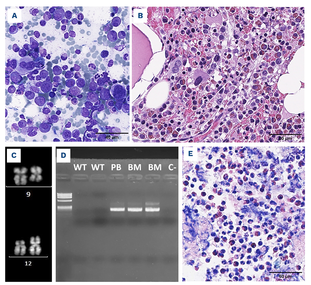 Figure 2.Morphologic and molecular picture of eosinophilic neoplasm. Bone marrow (BM) aspirate and biopsy feature mild trilinear dysplasia, left shifting and hypogranularity of eosinophils, with small-sized, hypolobated megakaryocytes ((A) May-Grünwald stain, 600x magnification; (B) hematoxylin and eosin stain, 400x magnification). (C) Karyotype analysis detected t(9;12)(q22;p13), (D) further confirmed by real-time polymerase chain reaction for ETV6::SYK, rearrangement. WT: wild-type probes; PB: peripheral blood; C-: negative control. (E) Histologic detail of endometrial biopsy (Giemsa staining, 400x magnification) documented accumulation of eosinophils, with defective nuclear segmentation.