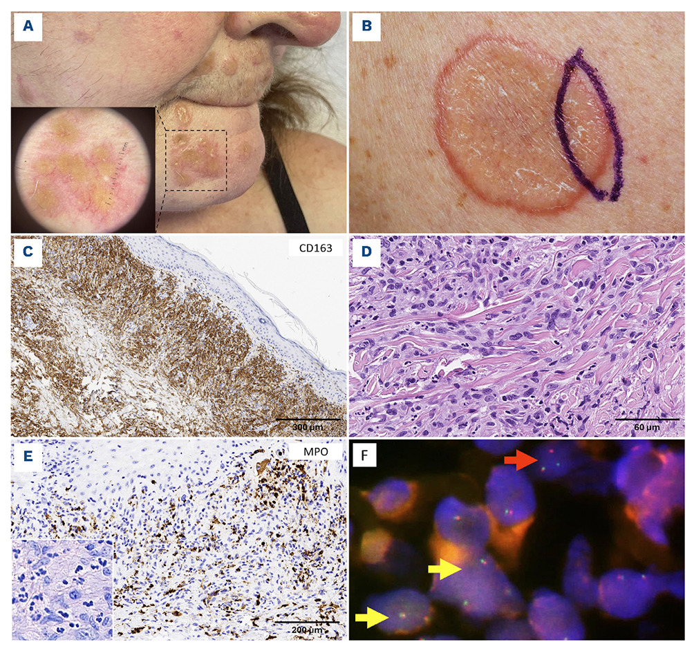 Figure 1.Clinic-pathologic picture of cutaneous, histiocytic manifestation. Representative panels depicting the clinical appearance of the skin lesions, as multiple, firm, partly confluent, erythematous to yellowish plaques, some with a slightly elevated border and an intensely yellowish, depressed central area involving (A) the face, scalp, and (B) the back. Dermoscopy (A, inset) showed yellowish structureless areas with short, branched vessels surrounded by peripheral erythema, a finding indicative of a granulomatous process. Cutaneous biopsy displaying a «busy dermis», secondary to the presence of an interstitial, patternless accumulation of “histiocytoid”, CD163+ histiocytes ((C) CD163, 100x magnification; ((D) hematoxylin and eosin staining, 400x magnification), with foci of accumulation of granulocytes with abnormal nuclear segmentation; ((E) myeloperoxidase stain, 200x magnification and inset, Giemsa stain, 400x magnification). (F) Fluorescense in situ hybridization analysis (SYK break apart probe) of skin biopsy displays scattered, small-sized nuclei featuring SYK locus break (red arrow) consistent with granulocytes, as compared to larger cells with a wild-type SYK pattern (yellow arrows).