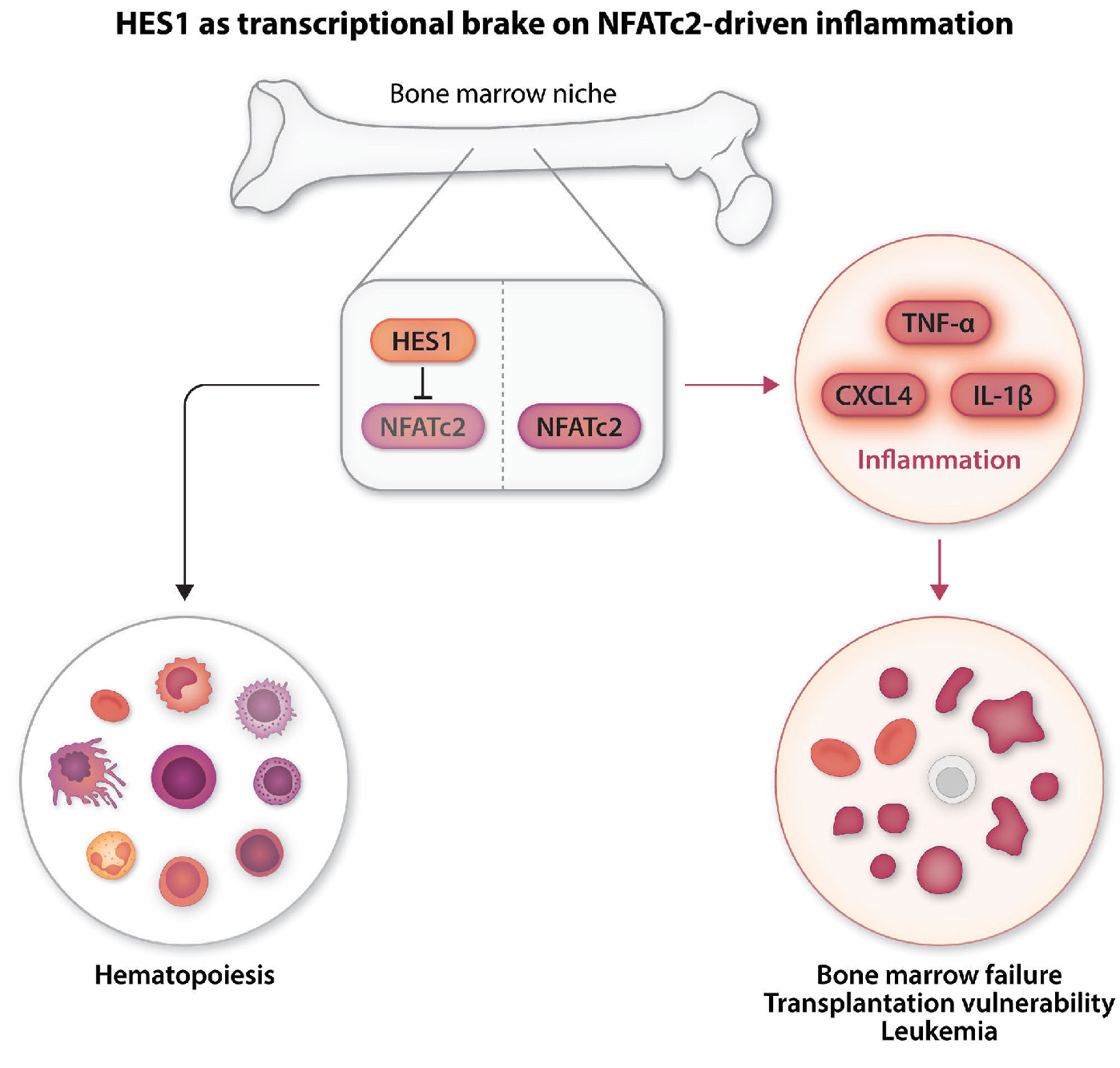 Figure 1.HES1 restrains NFATc2-driven inflammation in the bone marrow niche. Schematic model illustrating the role of HES1 in mesenchymal stromal cells (MSC). In normal MSC (black arrow), HES1 represses NFATc2, limiting cytokine output and supporting hematopoietic stem cell maintenance and balanced hematopoiesis. In the absence of Hes1 (red arrows), NFATc2 is derepressed, leading to increased production of inflammatory mediators such as TNF-α, IL-1β, and CXCL4. The resulting inflammatory milieu impairs MSC function, disrupts HSC quiescence, and contributes to hematopoietic stress, bone marrow failure, transplantation vulnerability, and leukemic remodeling.