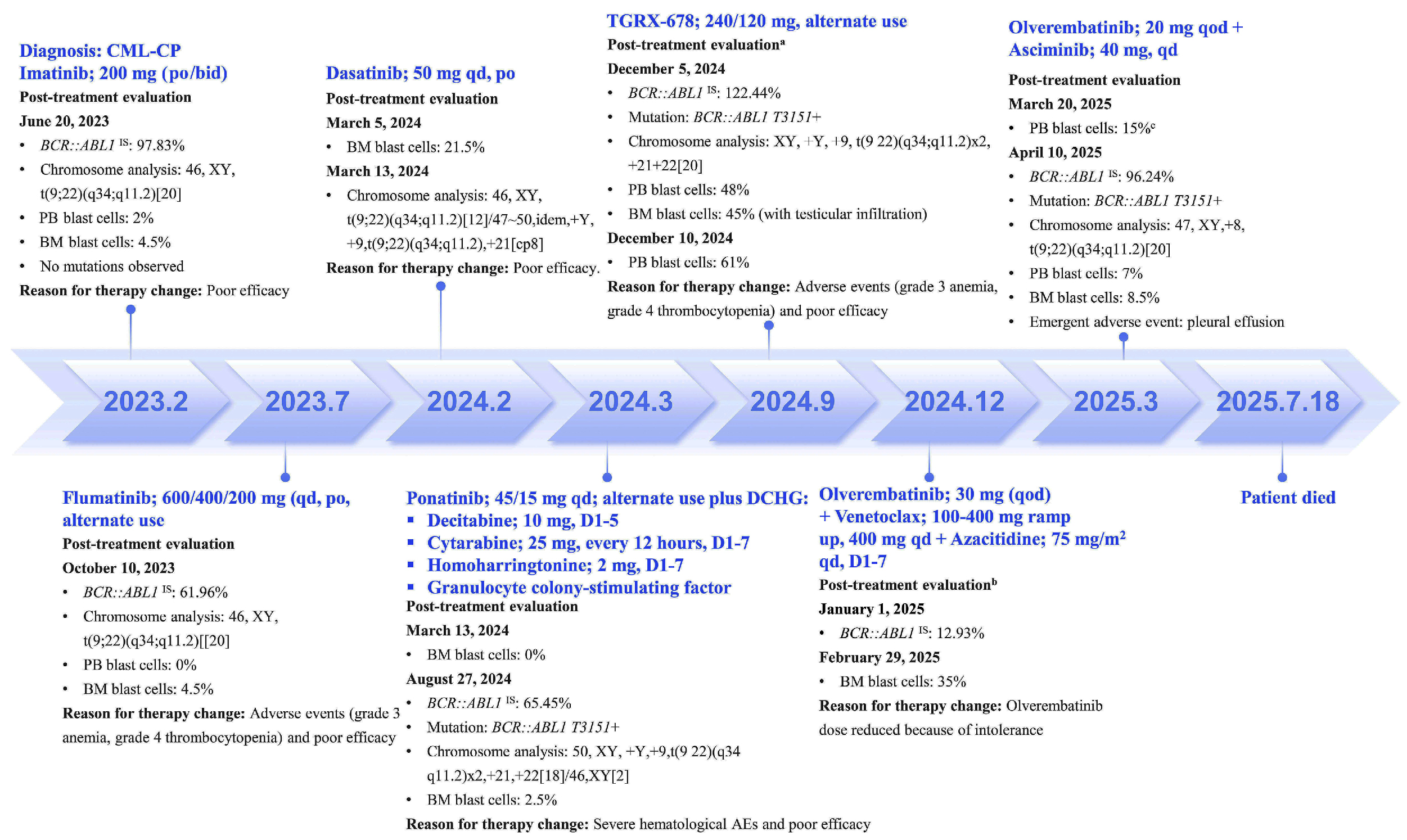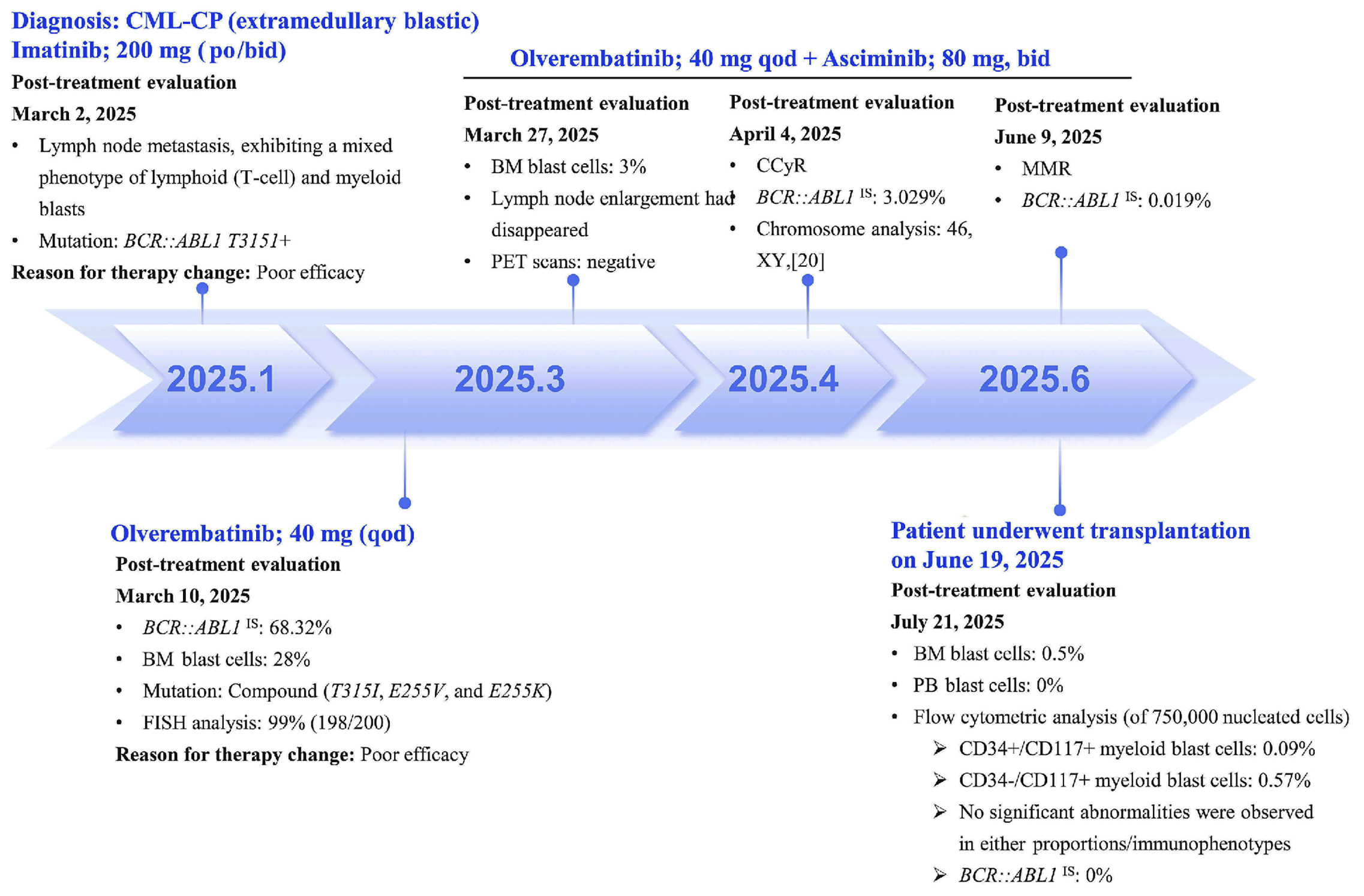 On March 20, 2025, flow cytometry analysis of a BM aspirate detected approximately 4.5% of abnormal cells were detected. A follow-up BM aspiration on April 10, 2025, indicated 8.5% blast cells with a BCR::ABLIS of 96.24% (karyotype: 47, XY, +8, t(9;22)(q34;q11.2)[20]); the disease returned to CML-CP and remained stable, with 2% blast cells noted on May 8, 2025. Because of economic difficulties, the patient declined allo-HSCT and died on July 18, 2025. The treatment timeline is outlined in Figure 2.