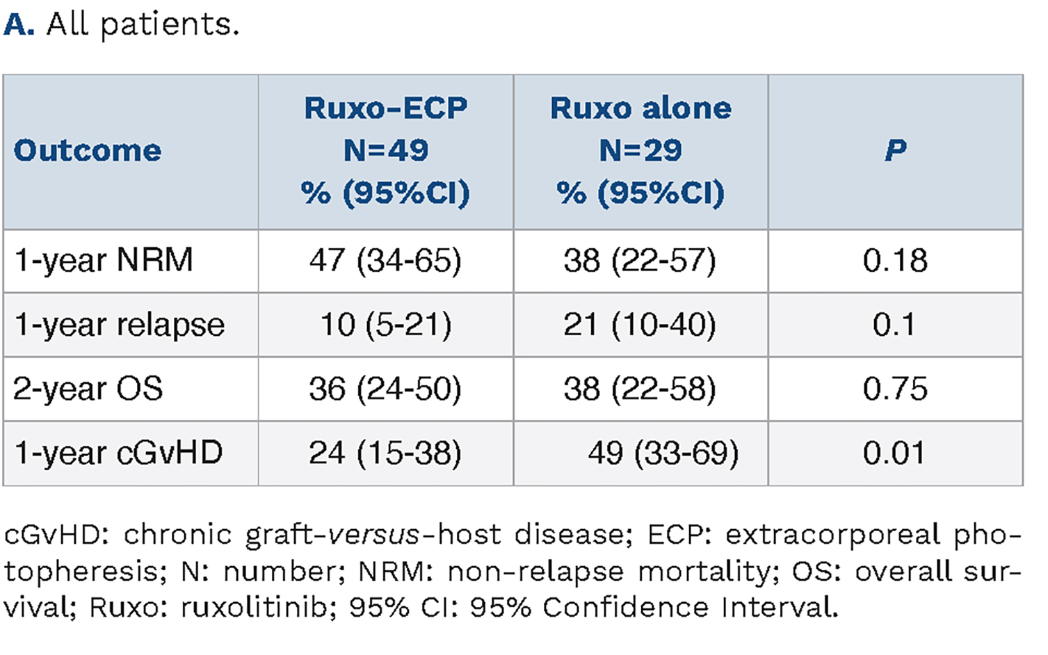 At six and 12 months, 25% and 20% of evaluable patients in the Ruxo-ECP cohort and 20% and 66% of evaluable patients in the Ruxo cohort experienced cGvHD, resulting in a cumulative incidence of cGvHD at one year of 24% (95%CI: 15-38%) after Ruxo-ECP and 49% (95%CI: 33-69%) after Ruxo.