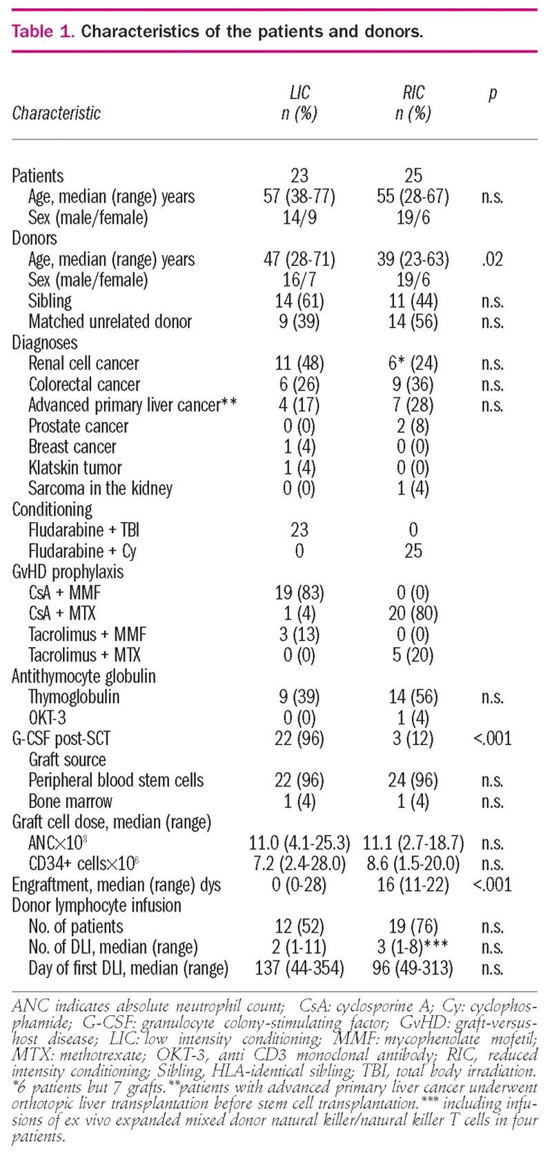 In this non-randomized study we compared low intensity conditioning with RIC in patients undergoing allogeneic hematopoietic SCT for solid tumors.