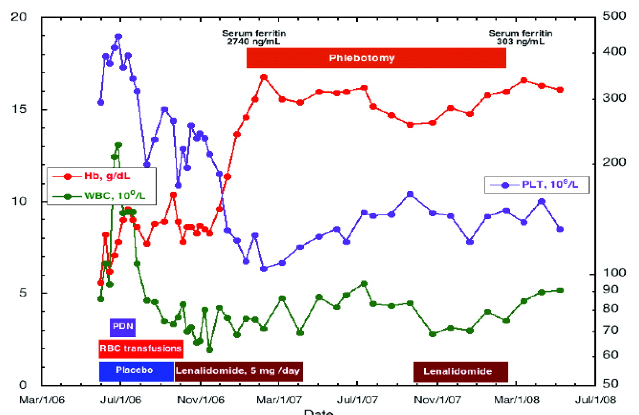 In a commentary29 to the first study on the use of lenalidomide in patients with MDS,27 we concluded that, although this treatment was promising, its feasibility and adverse effects needed to be defined more precisely in prospective studies. An European, multi-center, randomized, double-blind, placebo-controlled, three-arm study is currently evaluating the efficacy and safety of two doses of lenalidomide versus placebo in transfusion-dependent subjects with low- or intermediate-1-risk MDS associated with del(5q) (http://www.clinicaltrials.gov/ct/show/NCT00179621). The outcome of one of the patients enrolled in this study is reported in Figure 3 to illustrate the remarkable efficacy of lenalidomide in some patients with 5q- syndrome. It should be noted, however, that lenalidomide treatment of patients with MDS and del(5q) is challenging for clinicians and requires considerable hematologic know-how, especially because it may be associated with long-lasting grade 3–4 neutropenia and/or thrombocytopenia.28