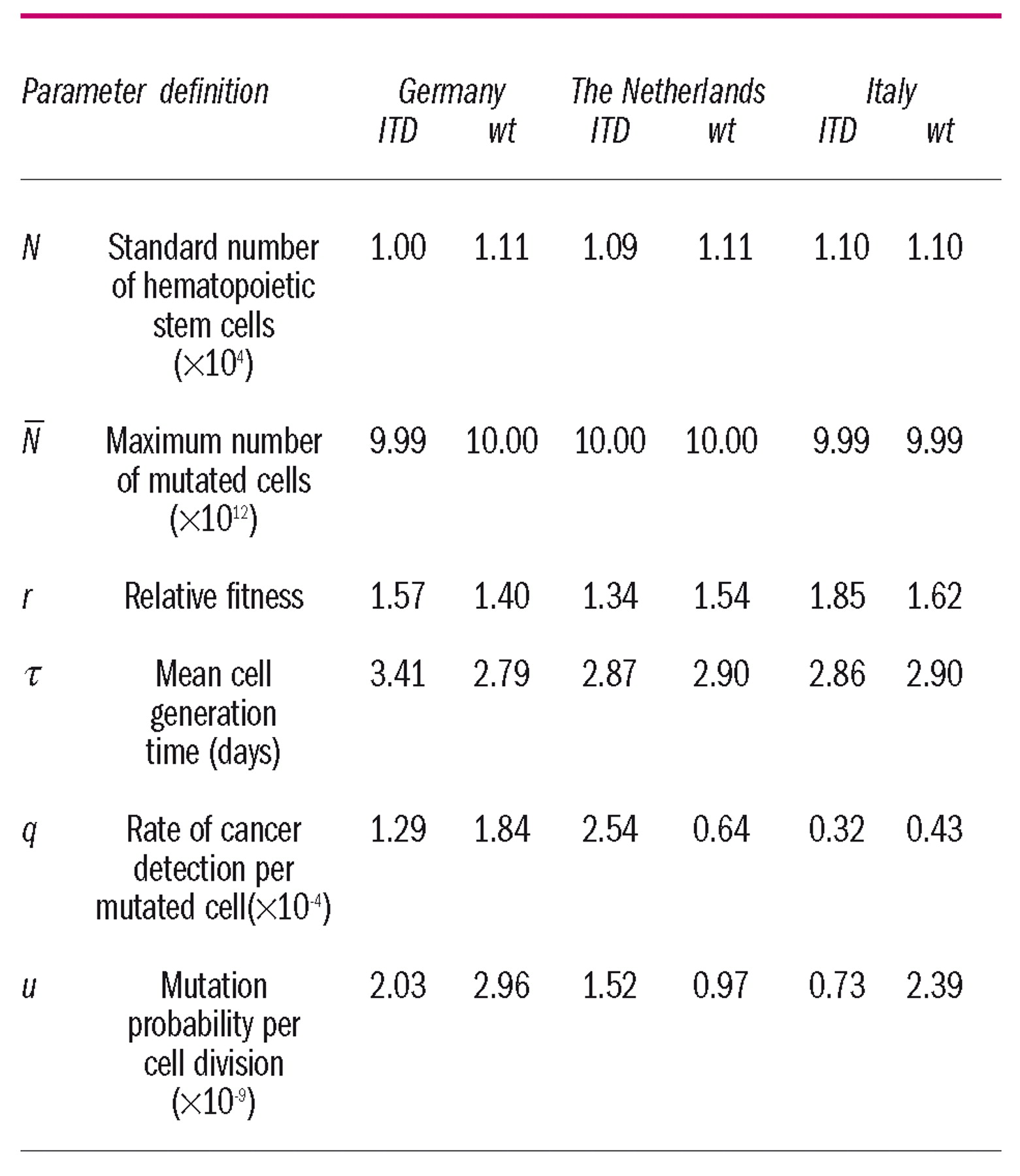 Table 3.Parameters of the one-mutation model for the NPM1-mutated/FLT3-ITD and NPM1-mutated/FLT3 wild-type (wt) subsets.