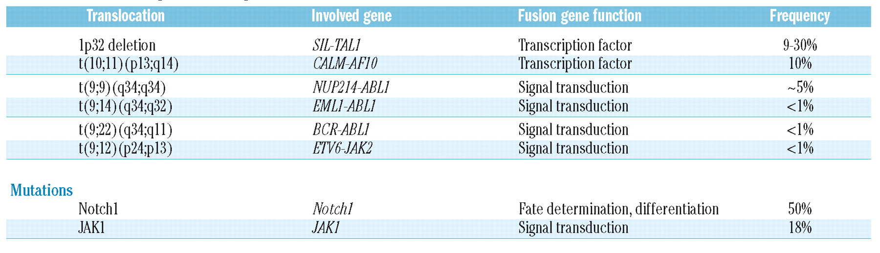 Aberrations involving the 14q11 (TCRA/D) and 7q34(TCRB) regions can be detected in 35% of patients.6 They juxtapose enhancer elements of the TCR genes with transcription factors involved in T-cell differentiation, with deregulation of hemopoiesis (Table 1).