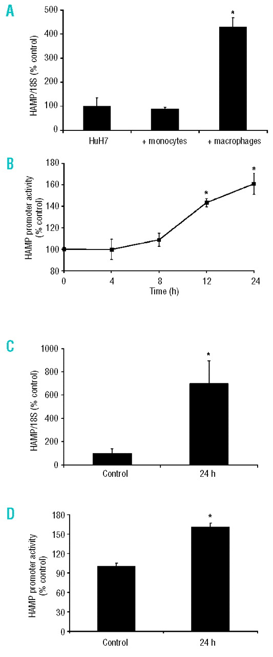 In order to further examine hepcidin induction in this co-culture system a luciferase reporter construct containing 942 bp of the HAMP promoter was transiently transfected into HuH7 cells. Co-culturing HuH7 hepatoma cells with differentiated THP1 cells caused a progressive time-dependent increase in HAMP promoter activity, reaching 143±7% of the control activity after 12 h and 160±17% after 24 h (both p<0.01 compared to baseline; Figure 1B).