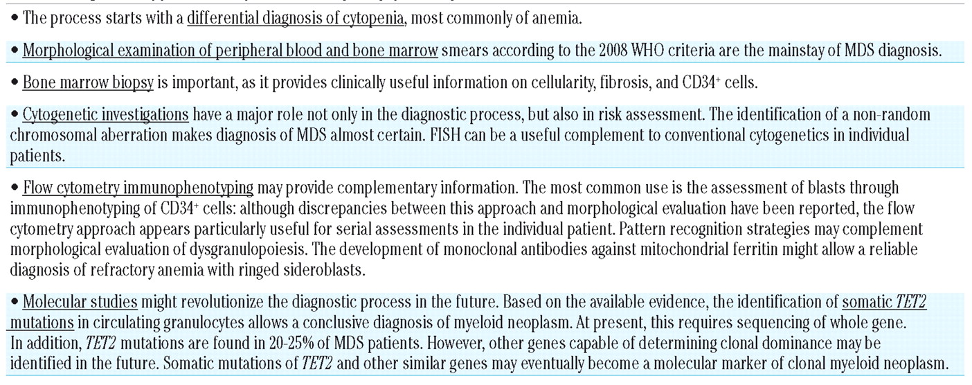 Table 1.Diagnostic approach to a patient with myelodysplastic syndrome: standard and novel tools.