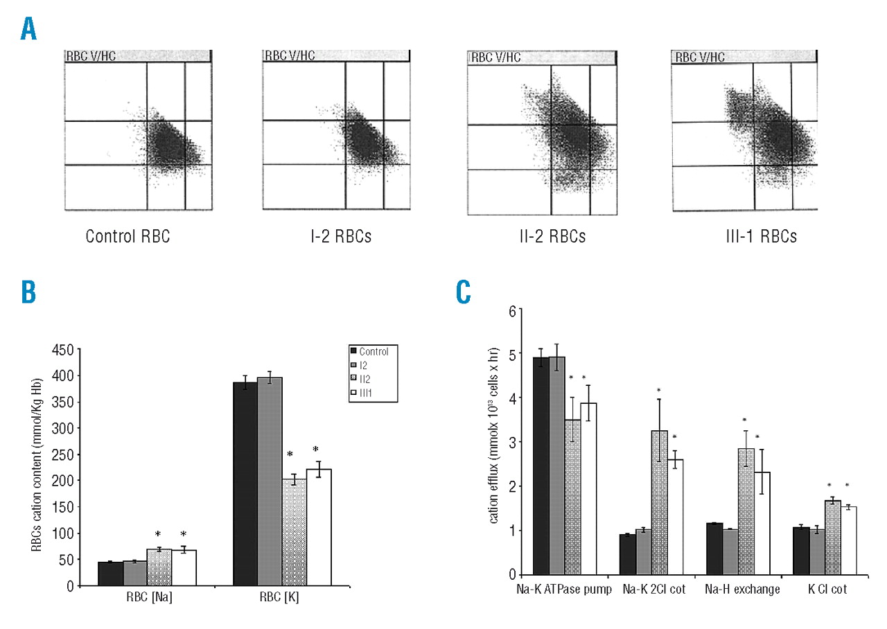 The fact that the MCV and hemoglobin distribution width of reticulocytes from II-2 and III-1 were increased (Table 1 and Figure 3A) suggested that abnormalities in red cell volume regulation were already present in reticulocytes and were not related to the permanence of red cells in the peripheral circulation.