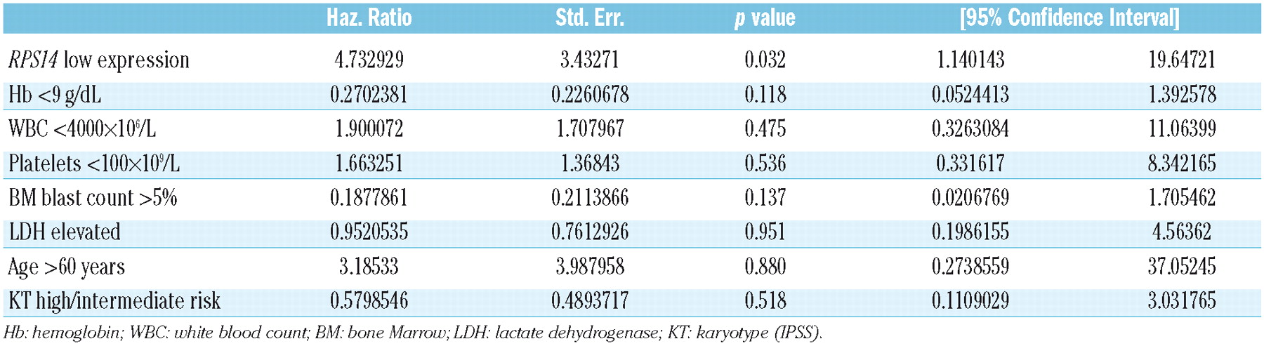 To further clarify the role of ribosomal protein S14 (RPS14) in myelodysplastic syndrome, we examined RPS14 transcription in bone marrow derived CD34+ cells from patients with non-5q- myelodysplastic syndrome and found a reduced expression of RPS14 in 51 of 72 (71%) patients. MDS patients with an intermediate-1 risk (INT-1) score according to the international prognostic scoring system and low RPS14 expression had a superior median overall survival of not reached versus 25 months compared to INT-1 patients with high RPS14 expression (p=0.0249). Using multivariate analysis, the RPS14 expression status was confirmed as an independent predictor for survival in INT-1 patients.Introduction