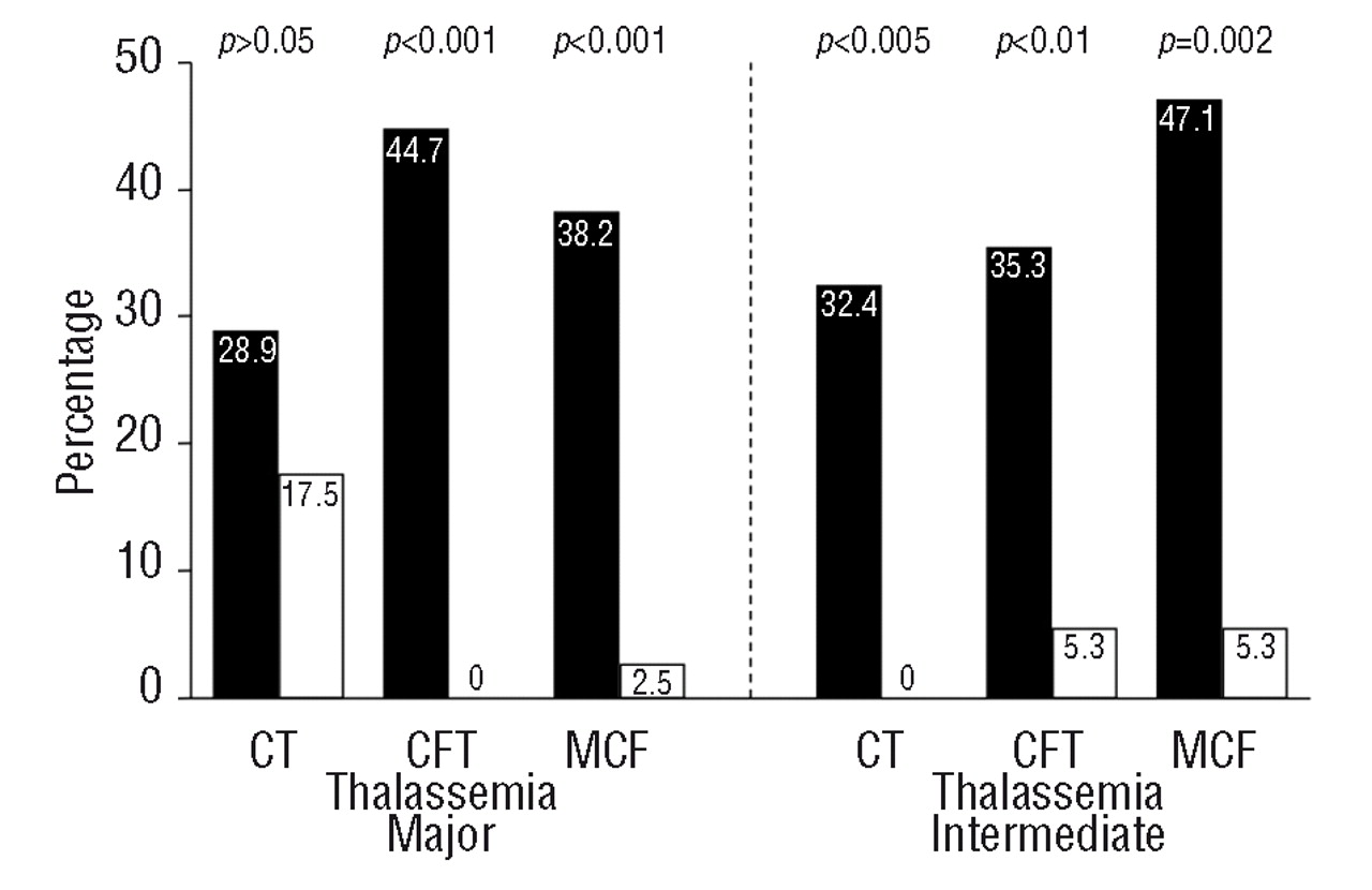 Figure 2.Percentage of patients identified as having values of thromboelastometry parameters below the 5th (for CT and CFT) or above the 95th percentile (for MCF). Solid and open columns represent splenectomized or non-splenectomized patients, respectively.