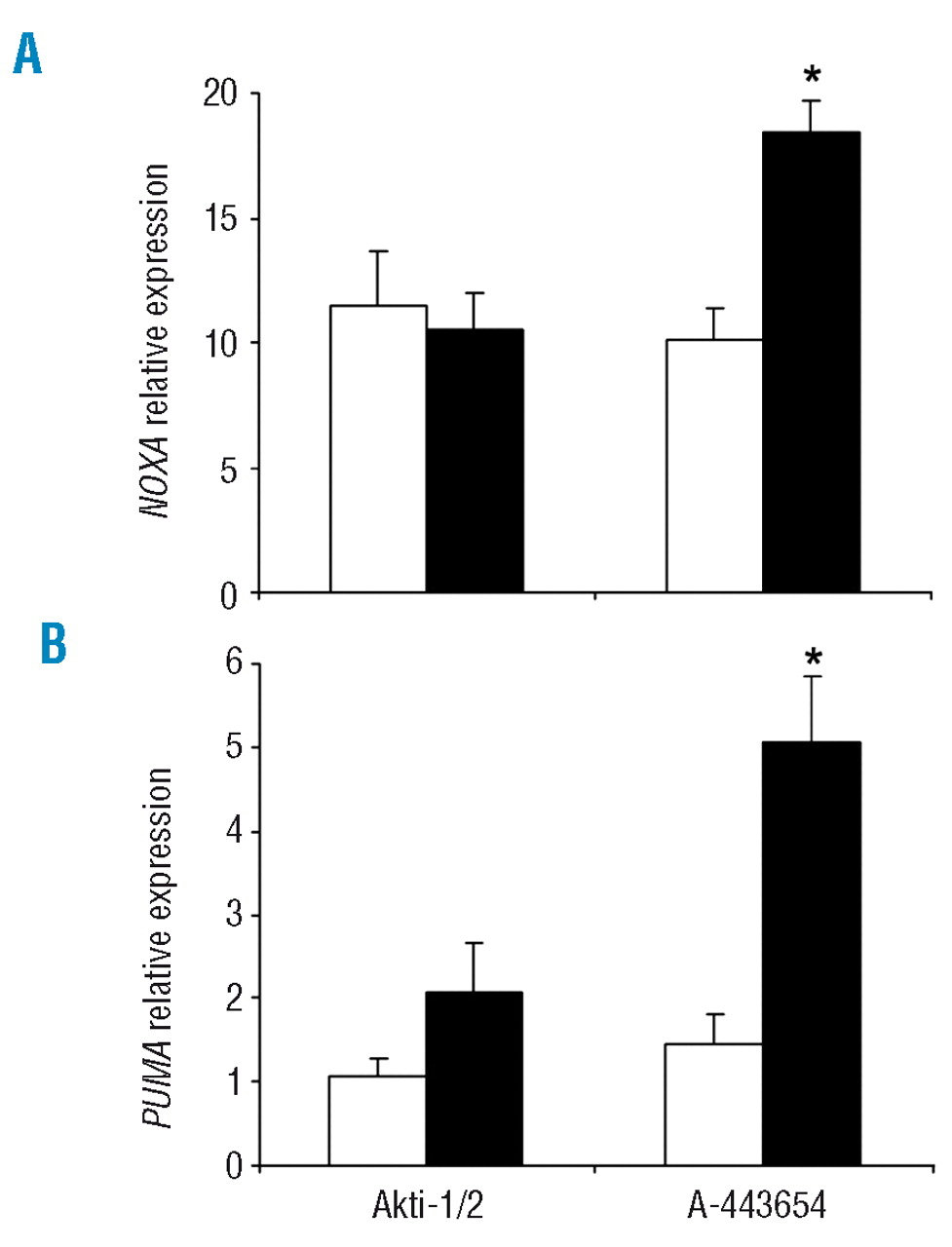 Figure 4.Apoptosis-related gene expression profile induced by Akti-1/2 and A-443654. Cells from CLL patients were untreated (open bars) or treated with 5 μM Akti-1/2 or 0.5 μM A-443654 (black filled bars) for 24 h. Cells were lysed, and NOXA (A) and PUMA (B) mRNA expression was analyzed by RT-MLPA as described in the Design and Methods section. The results are shown as the mean value ± SEM of four and eight different experiments for Akti-1/2 and A-443654, respectively. *p<0.005 treated versus untreated cells.