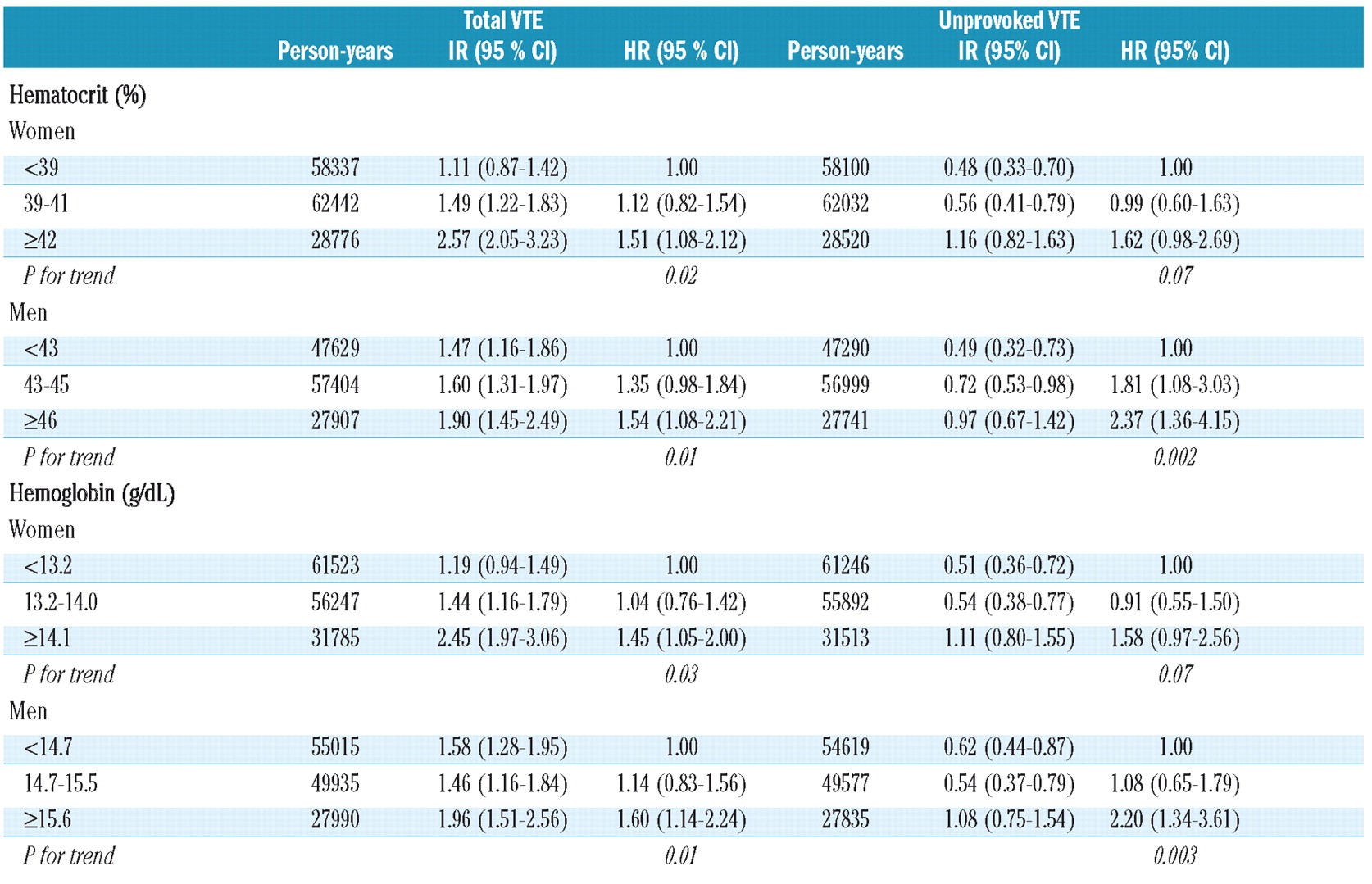 Similar patterns for risk of VTE were found for hemoglobin. Women with a hemoglobin concentration of 14.1 g/dL or more had a 1.45-fold (95% CI: 1.05–2.00) higher risk of total VTE compared to women with a hemoglobin level less than 13.2 g/dL (P for trend: 0.03), and men with a hemoglobin 15.6 g/dL or more had a 1.6-fold (95% CI: 1.14–2.24) higher risk of total VTE and 2.2-fold higher risk of unprovoked VTE compared to men with whose hemoglobin concentration was less than 14.7 g/dL (P for trend: 0.01 and 0.003, respectively) (Table 4).