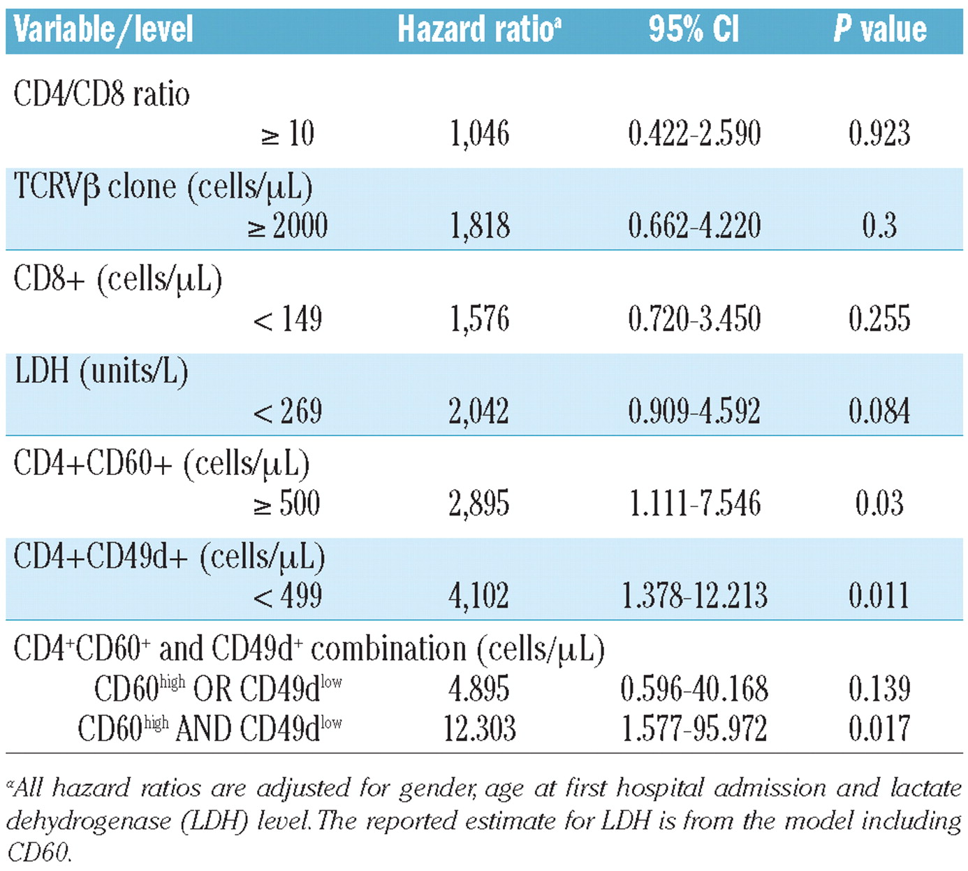 Next, we applied Cox regression models to investigate whether, when simultaneously controlling for established prognostic factors for SS (i.e. CD4/CD8 ratio and lactate dehydrogenase serum levels), the levels of CD60 and CD49d expression on CD4 T lymphocytes were still significantly associated with survival (Table 3). However, high lactate dehydrogenase (>270 U/L) showed a hazard ratio of 2.042 with a P value of 0.08, i.e. very close to the 0.05 conventional level of significance. In addition, the multivariate analysis confirmed an exceedingly high risk of death for patients with a combination of CD4CD60 cells (≥0.5×10/L) and CD4CD49d cells (<500×10/L). In all multivariate models, CD60 remained significantly associated with the outcome. Several variables were excluded from this analysis because they violated the proportionality assumption of the Cox model (e.g. for CD8, percentages below 7.5% had a better 5-year survival, but a poorer 10-year survival compared with the opposite phenotype).