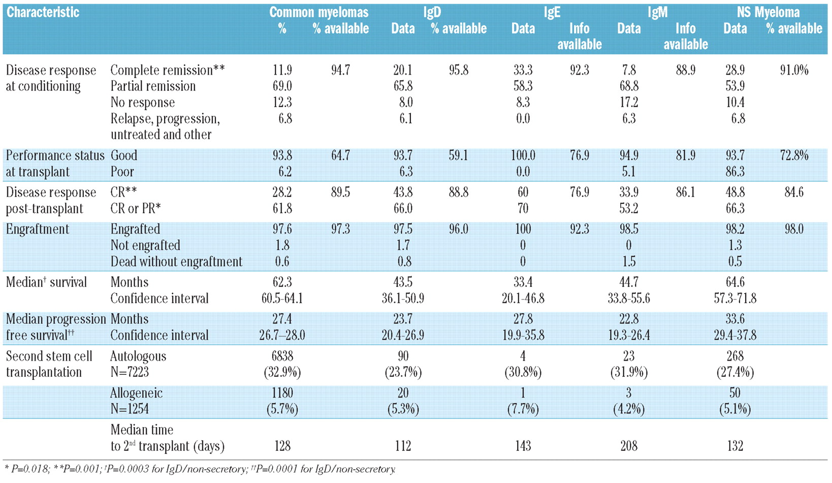 Table 2.Comparison of disease response to therapy and engraftment between patients with IgD, IgE, IgM and non-secretory myelomas and those with with common types of myeloma.