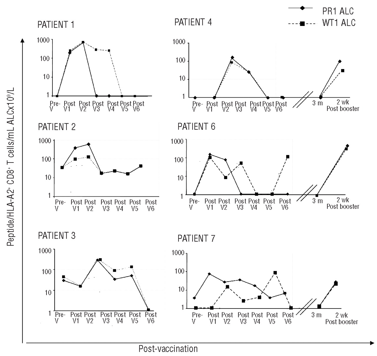 Figure 1.Kinetics of vaccine-induced PR1- and WT1-specific CD8+ T-cell response in 6 patients completing 6 courses of biweekly injections. Results in 6 individual patients who completed the vaccination program are shown. Weeks after vaccination are shown on the X-axis. PR1/HLA-A*0201+ (black diamond square and solid connecting line) and WT1/HLA-A*0201+ (black square and dashed connecting line) CD8+ T cells are expressed as absolute numbers per mL of peripheral blood (Y-axis). The vaccine-induced CD8+ T-cell responses after PR1 and WT booster injection for patients 4, 6 & 7 are presented. Abbreviations: ALC: absolute lymphocyte count, V: vaccine dose.