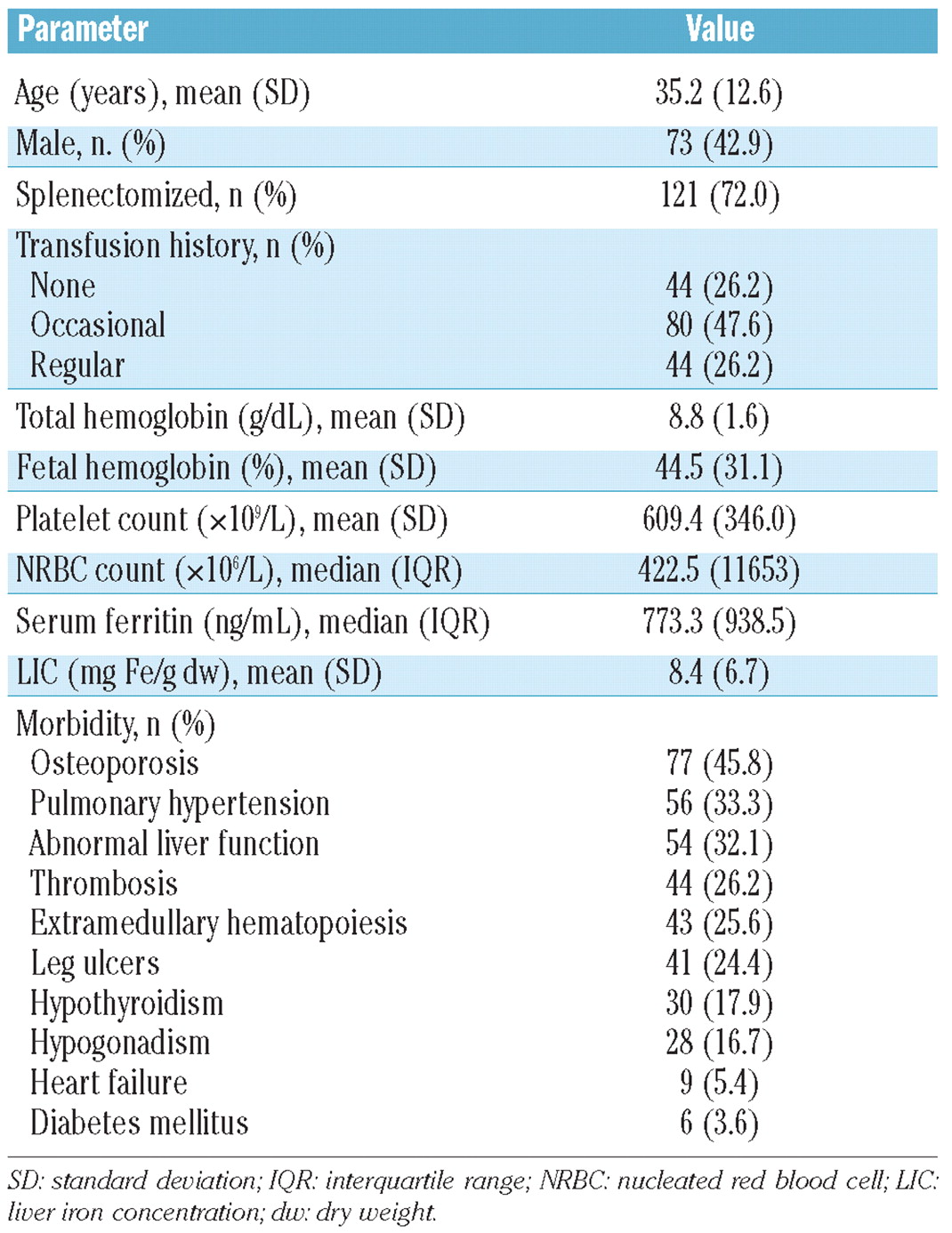 The aim of this study was to evaluate the association between iron overload, as determined by LIC, and morbidity in a large cohort of patients with β thalassemia intermedia.