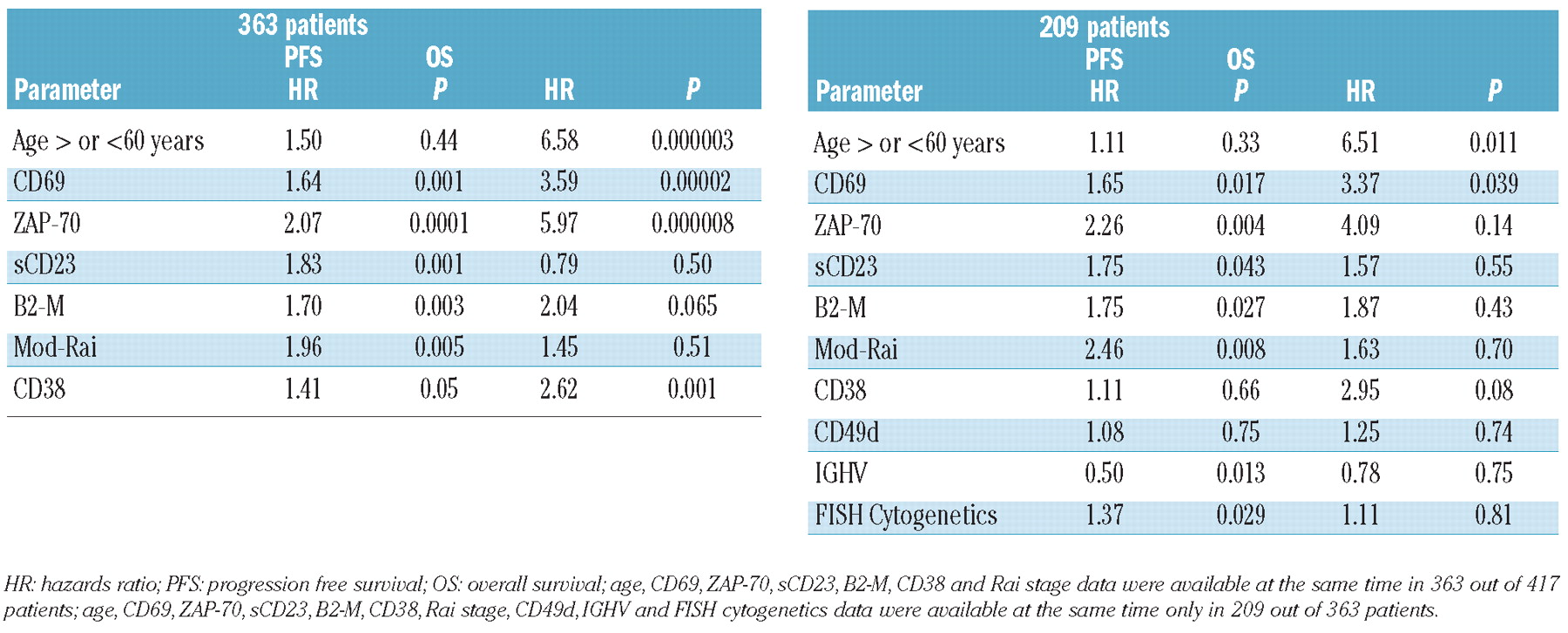 The value of CD69 as independent prognosticator for OS was checked by multivariate Cox’s proportional hazards analysis applied to models including the prognosticators proven to be significant in univariate analyses (Table 1). In our cohort of 363 of 417 patients, multivariate analysis selected CD69 (P=0.00002), ZAP-70 (P=0.000008), CD38 (P=0.001), age (P=0.000003) as significant independent prognosticators (Table 2). In a further model, adjusting also for the IGHV status, FISH cytogenetics and CD49d, available at the same time in a smaller number of patients, (209 of 363 cases; Table 2) again CD69 was an independent prognostic factor for OS (P=0.039), along with age (P=0.011).