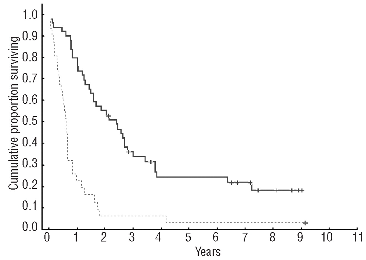 Patients with primary resistant disease have a poor prognosis with standard chemotherapy, with a median overall survival between 1.5 and 3 years.15,29 It has been suggested that these patients are the most likely to benefit from ASCT provided that the rescue transplant is performed early in the course of the disease before the emergence of resistant clones. In six published series, the reported complete response rate was between 8–40% and the overall survival ranged from 4 to 6 years.15–19 Thus, in a series from the M. D. Anderson,15 the median event-free survival and overall survival of 27 patients with primary resistant disease who received a transplant during the first year after initiation of therapy were 3.5 and 6 years, respectively. In addition, in one study from the University of Arkansas,16 the median event-free survival and overall survival in 72 patients with primary unresponsive disease were 21 and 47 months, respectively. In a study at the Royal Marsden Hospital, the complete response rate after transplantation was 40% in a series of 43 patients with primary refractory disease: in this series, the complete response was only assessed by immunoelectrophoresis. In a series of patients studied by Kumar et al.,19 the post-transplant response rate was 92%, including 20% complete responses defined either by immunoelectrophoresis or immunofixation, with no significant differences in event-free and overall survival rates at 1 year post-transplant between chemosensitive patients and patients with primary refractory disease. In the largest series of 89 patients, published by Alexanian et al.,20 the complete response rate post-transplant was 16% and the overall survival longer than 7 years for those patients who achieved a complete response. These “good” results are in contrast with those reported by Rajkumar et al.17 for a small series of 12 patients with primary refractory disease who had a post-transplant complete response rate of 17% and median overall and progression-free survivals of only 30 and 26 months post-transplant, respectively.
