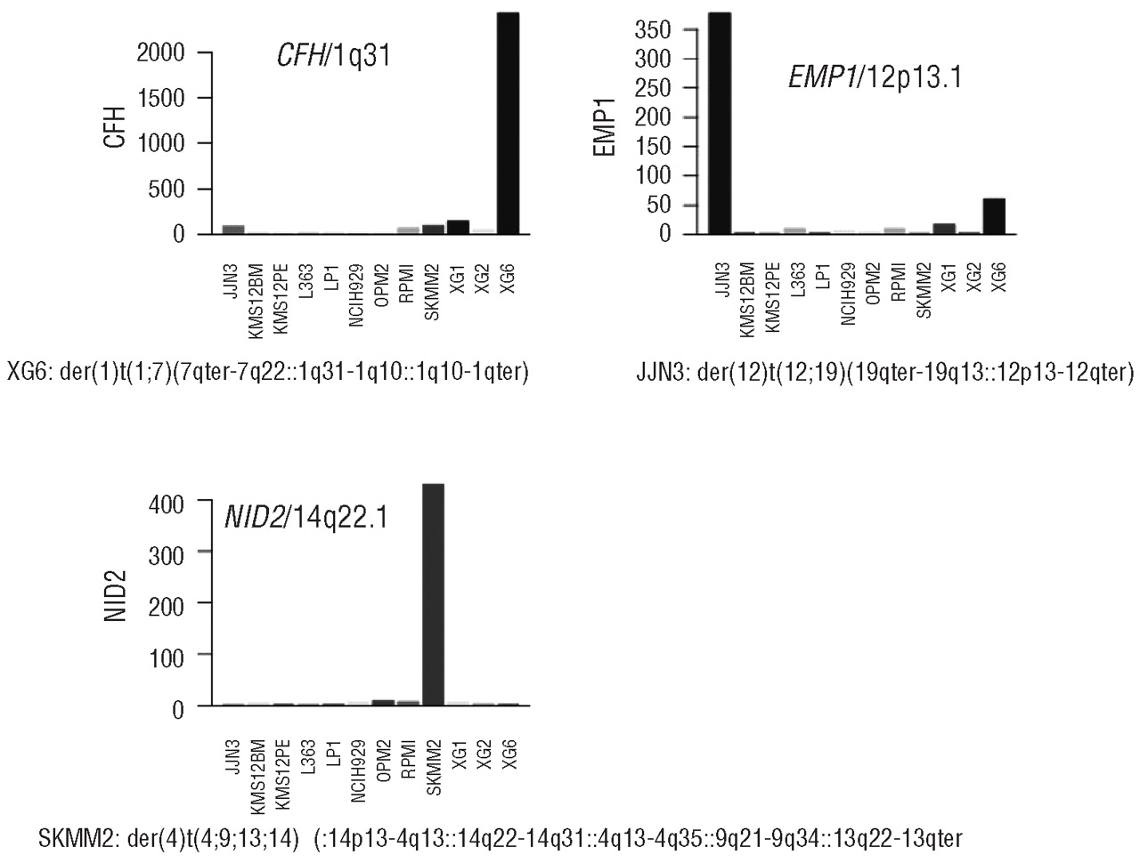 Figure 2.Link between spike expression and translocation. We investigated whether genes located in a given translocation-associated breakpoint could have a spike expression in the human myeloma cell lines presenting the given breakpoint only. Representative data are shown for CFH (1q31), EMP1 (12p13), and NID2 (14q22.1) genes. Barplots show the Affymetrix expression signal.