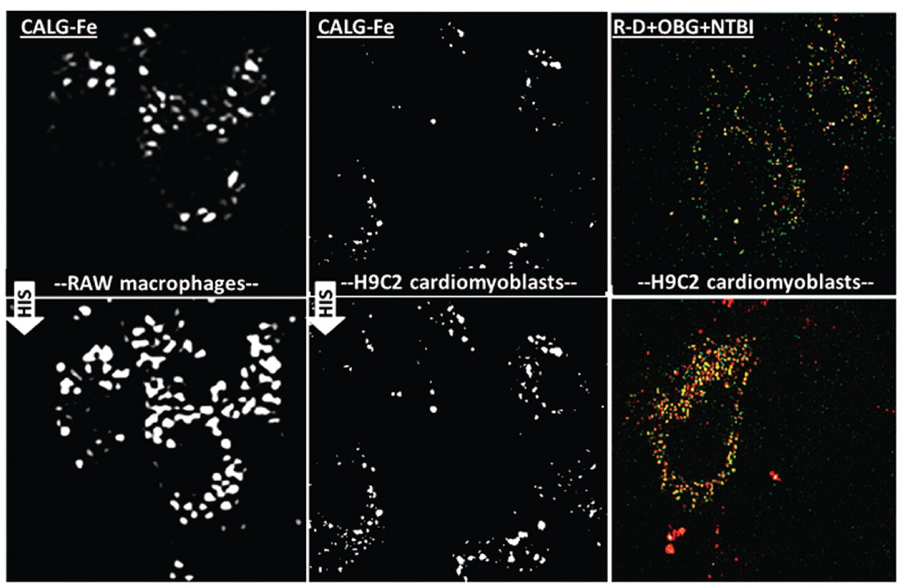 Figure 3.Uptake of NTBI into the endosomal compartment of various cell types RAW, macrophages (left panels) and H9c2 cardiomyoblast cells (middle panels) were loaded with calcein-green-iron complexes (CALG-Fe 20 μM) for 3 h and washed extensively. SIH (50 μM) was added and the fluorescence in the same fields was inspected 10 min later (lower left and lower middle panels). H9c2 cardiomyoblasts were exposed for 18 h to Oxyburst-green (400 μg/mL) + Rhodamine-dextran (R-D) (30 μM) in growth medium supplemented with NTBI in the form of 30 μM ferric citrate + HSA (50 μM) (RD+OBG+NTBI) (upper right panel) and after washing they were challenged with H2O2 (50 μM) (lower right panel) as described in Figure 2 for RAW cells. Colocalization of Oxyburst-green and Rhodamine dextran appears as yellow spots.