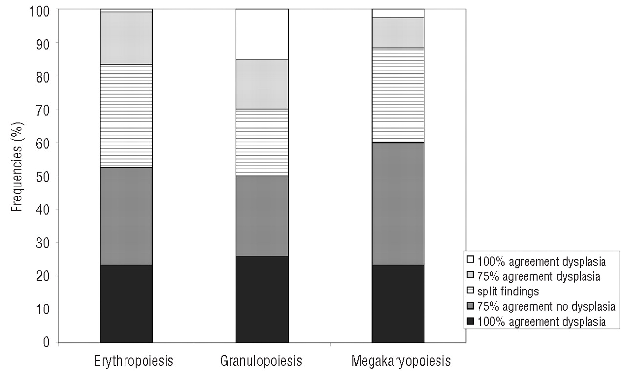 The poor inter-observer concordance was partly related to the closeness of the current WHO criteria cut off to the mean values observed in normal individuals in this study. Raising the threshold from 10% to an arbitrary threshold of 20% for all lineages led to a higher concordance rate. With this higher threshold, 4 investigators fully agreed on the absence of significant dysplasia in 82%, 54% and 81% of samples for erythropoiesis, granulopoiesis and megakaryopoiesis, respectively.