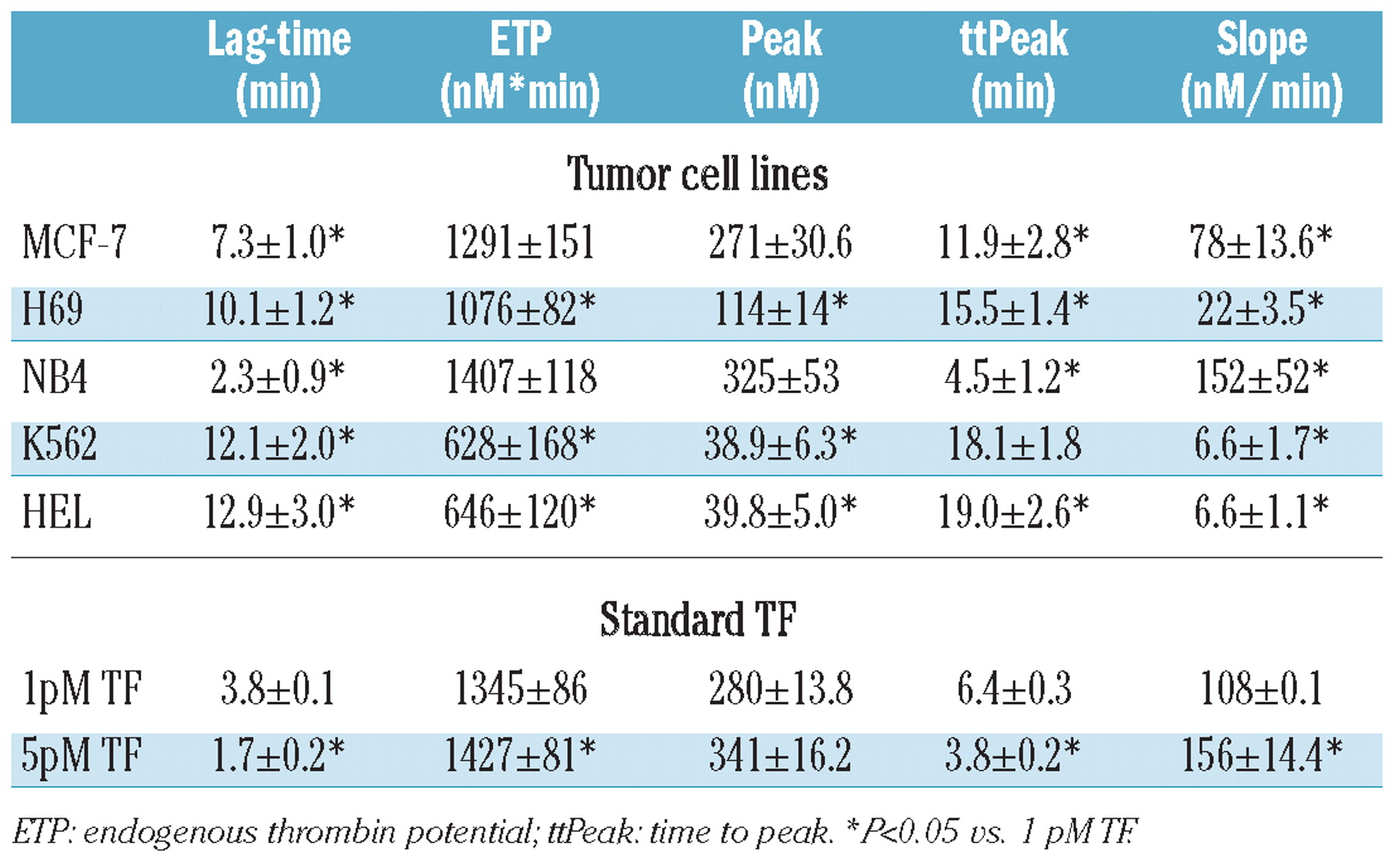 Table 1.Thrombin generation parameters of the different cell lines and of standard TF in platelet-free plasma (PFP). Cells were collected, washed and lysed in PBS at 3×106 cells/mL. Standard preparations of lipidated TF at 1 and 5 pM (Thrombinoscope) were used in the same experiments. Results are the mean ± SD of at least three different experiments.