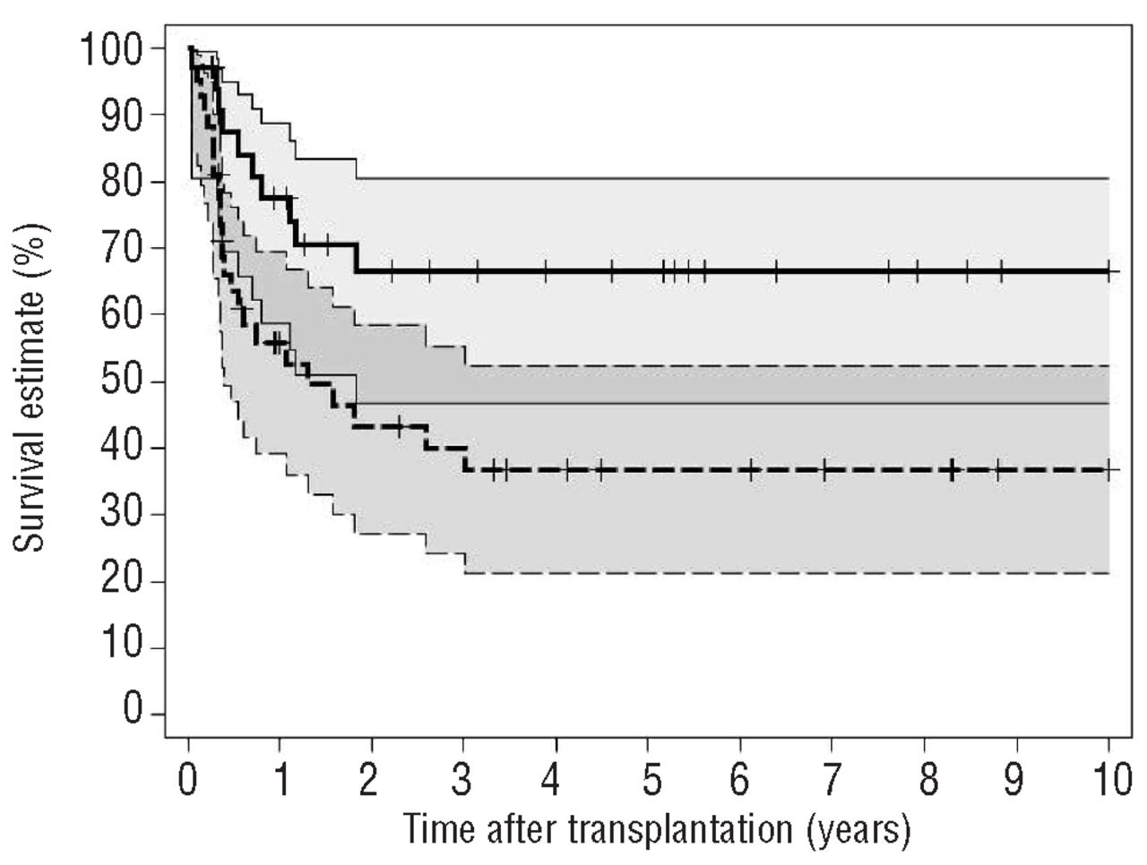 Figure 3.Predicted overall survival of patients stratified by pre-transplant pharmacotherapy. Kaplan-Meier analysis was used to predict overall survival in all 76 patients. P=0.007. Overall survival for patients not given pharmacological pre-treatment (n=33; solid line) and patients previously given pharmacotherapy (n=43; dashed line) is shown. Tick marks indicate surviving patients. The 95% confidence intervals for all values are indicated by shaded zones around the lines.