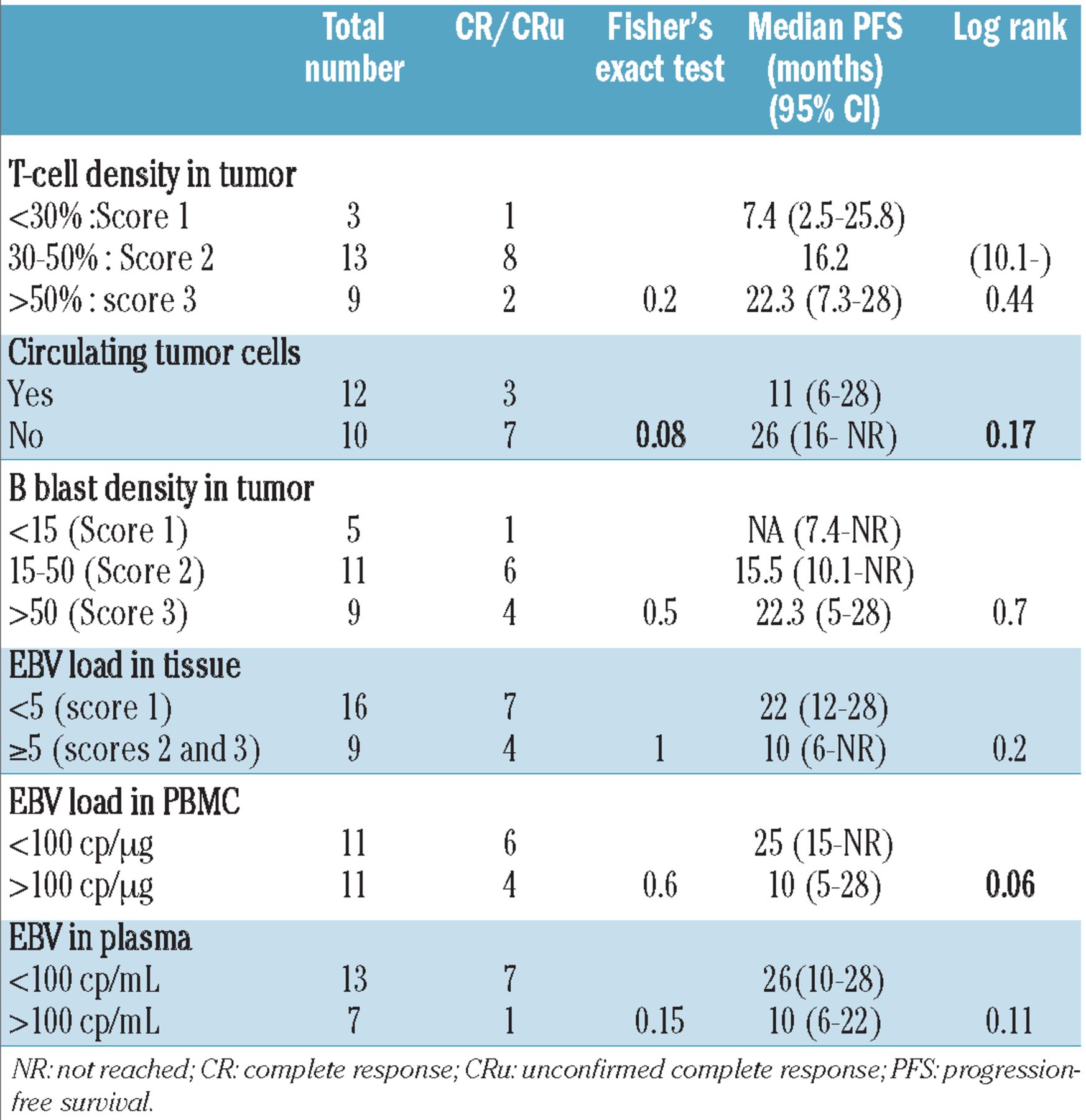 A relationship between rituximab-targeted cells evaluated at diagnosis and clinical outcome was determined. In univariate analysis, B-blast density in the tumor biopsy had no influence on clinical outcome, including response rate (Table 2). Although the detection of EBV copies in PBMC was not associated with response to treatment (P=0.6), (Table 2), it tended to be associated with a shorter progression-free survival (log-rank P=0.06) (Figure 6, Table 2). Circulating EBV was reviewed after treatment in 11 patients, five of whom were positive at diagnosis. Conversion to seronegativity was observed in four patients of whom three were in complete or complete unconfirmed response. The patient who remained positive was in partial response. Of note, out of the six EBV-negative patients at diagnosis, only one converted to being positive after treatment and was in partial response.