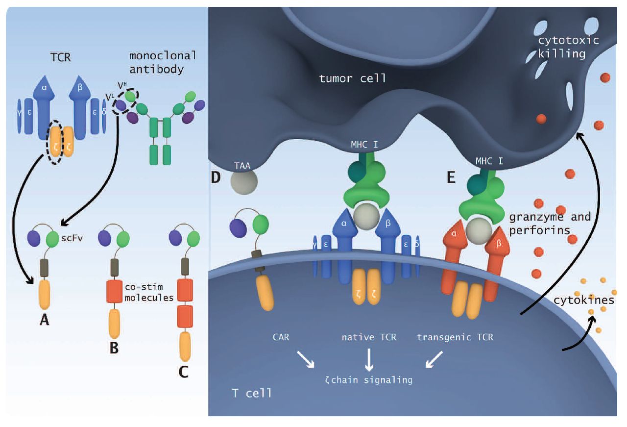 Figure 3.Redirecting T-cell specificity. T-cell specificity can be redirected by the expression of chimeric antigen receptors (CARs) or transgenic α-and β-TCR chains. (A) CARs are composed of two distinct fragments. The first is obtained by linking the variable heavy and light regions of a monoclonal antibody of known specificity into a single chain (scFv) and the second is the signaling region of the native TCR ζ-chain. (B) Second generation CARs incorporate co-stimulatory molecules such as CD28 and 4-1BB. (C) Third generation CARs include 2 or more co-stimulatory molecules. (D) CARs are activated after the scFv portion binds to an extracellular antigen thus the antigen recognition is MHC-independent. (E) Transgenic TCRs recognize specific peptides presented in the context of MHC class I molecules.