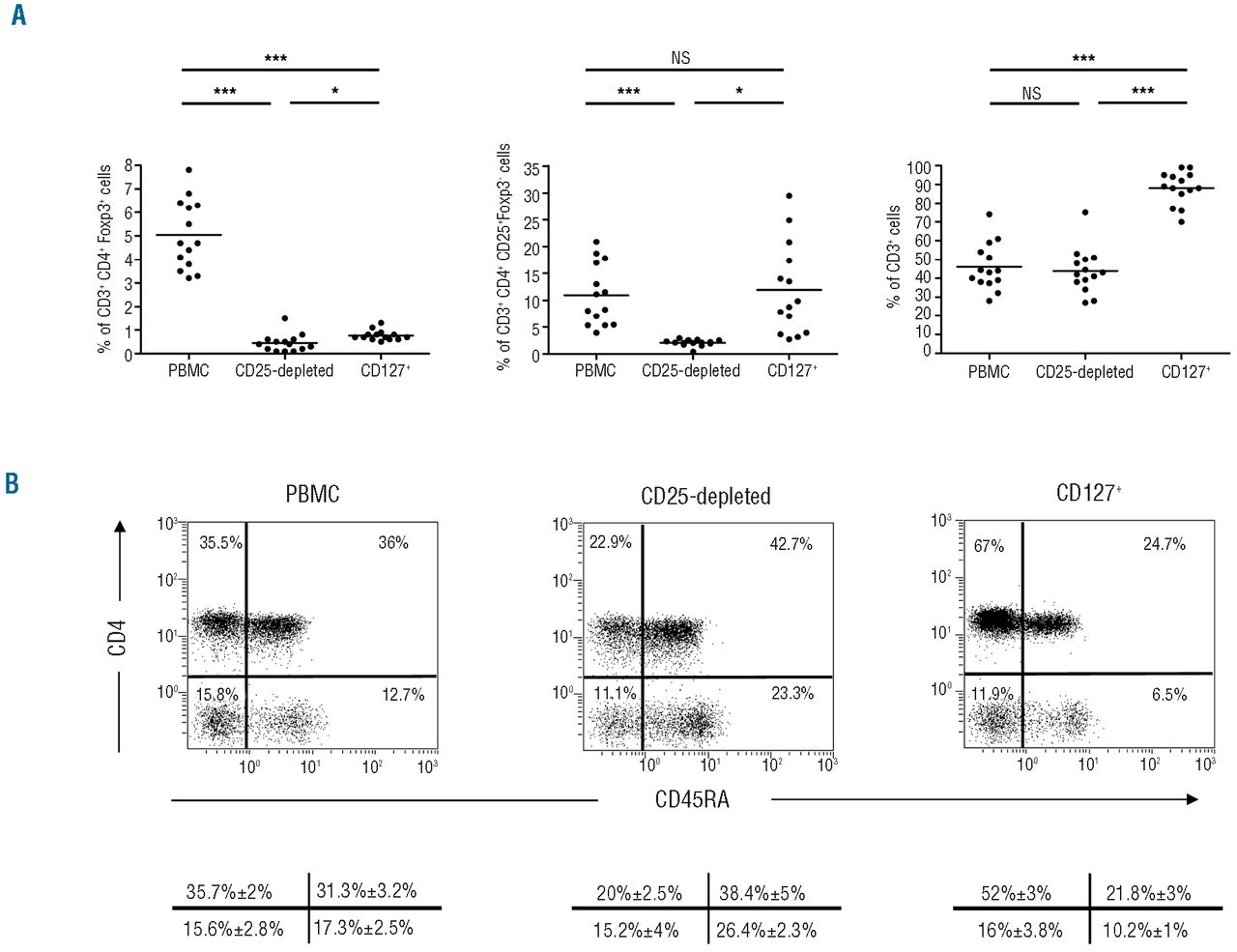 Importantly, CD127 selection did not alter the content of CD25Foxp3 non-Treg cells, as illustrated in Online Supplementary Figure S1 since we observed similar proportions of CD3CD4CD25Foxp3 in PBMC and CD127-positively selected cells (10.9%±1.5 and 11.9%±2.3, respectively). In contrast, this population was dramatically reduced (2.1%±0.2) following CD25 Treg depletion (Figure 2A, middle panel). Of note, the CD127 method significantly enriched the product in CD3 T cells (88.2%±2.3) when compared with PBMC and CD25- depleted cells (43.1%±3.3 and 43.8%±3.2, respectively, Figure 2A, right panel, P<0.001 and Online Supplementary Figure S2).