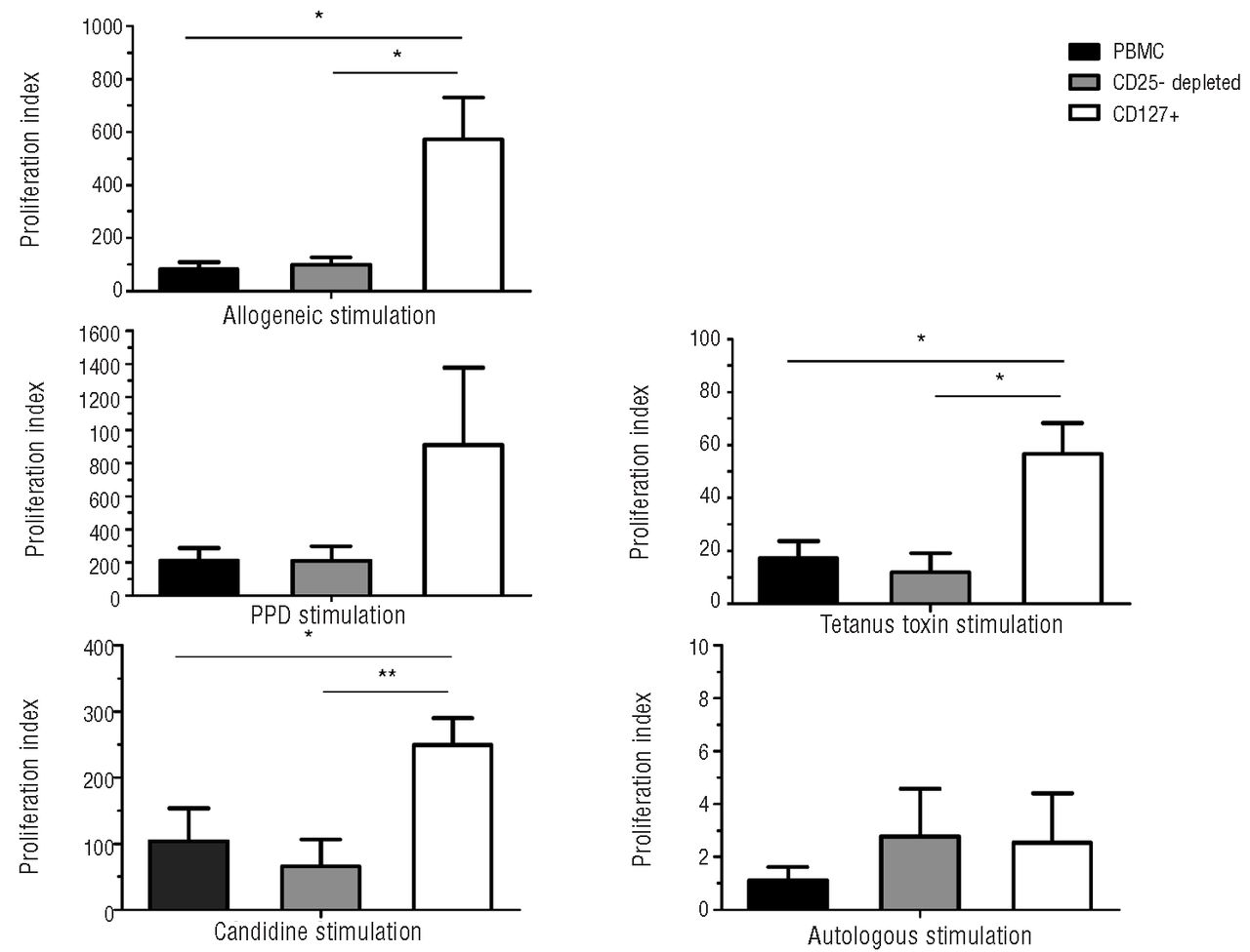 Figure 3.In vitro functional analysis of cells following Treg depletion. PBMC and Treg-depleted cell populations were tested for their capacity to respond to allogeneic, pathogen-specific or autologous stimulation after 6 days of culture. Histograms represent the proliferation index calculated as proliferation (cpm) of stimulated cells divided by proliferation of non-stimulated cells. Data represent mean ± SEM of four [allogeneic and purified protein derivative (PPD) stimulation] and five [tetanus toxoid (TT) and candidine] independent experiments.