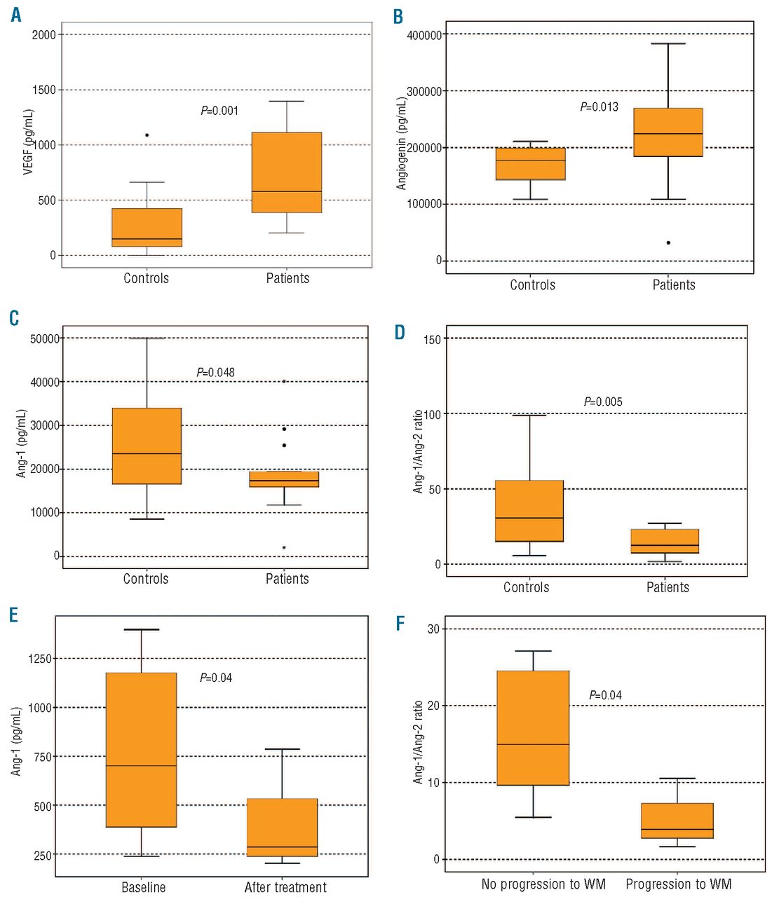Figure 2.At diagnosis patients with Schnitzler syndrome had increased circulating levels of VEGF (A) and angiogenin (B) compared to healthy controls and decreased angiopoietin-1 (C) and angiopoietin-1/angiopoietin-2 ratio (D) suggesting increased angiogenic activity. After successful treatment with pefloxacin or anakinra, VEGF levels decreased (387±207 pg/mL) compared to baseline values (P=0.04). (E) Three patients who progressed to overt WM had decreased levels of angiopoietin-1 to angiopoietin-2 ratio at diagnosis compared to all other patients (5.3±4.6 vs. 16.5±8.0; P=0.04, F).