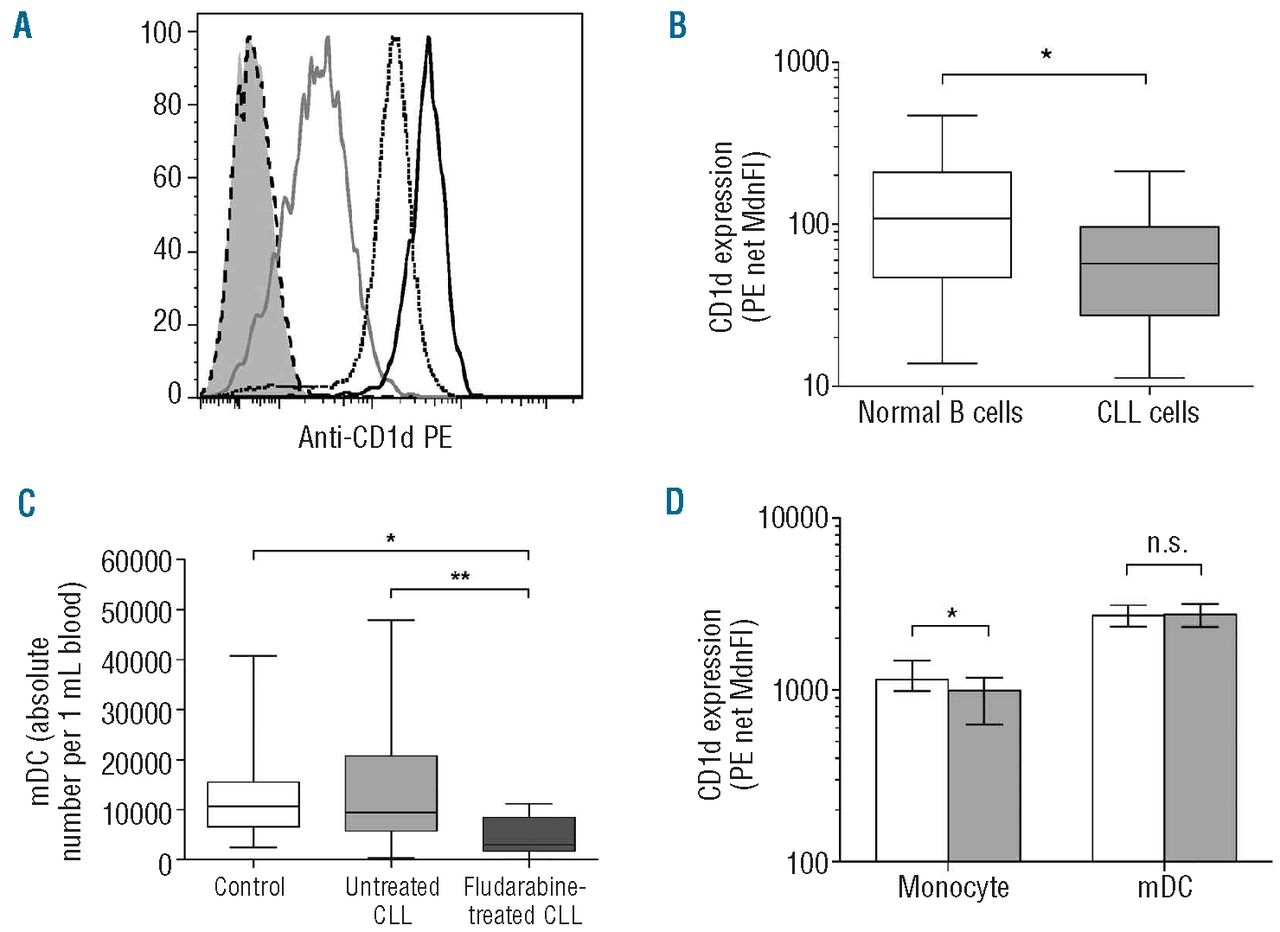 Figure 2.CD1d expression on circulating PBMC in patients with CLL. (A) Representative flow cytometry histogram showing CD1d expression on PBMC subsets from a patient with CLL. T-cell (dashed line), B-cell (gray line), monocyte (dotted line) and myeloid dendritic cell (mDC) (solid line) CD1d expression and fluorescence of matched isotype control-stained cells (solid gray) are shown. (B) CD1d expression on normal B cells (CD19+CD5-) and CLL cells (CD19+CD5+) from patients with CLL (n=20) (*P<0.05). (C) Absolute number of circulating mDC in healthy controls (n=30) and in patients with untreated (n=30) and fludarabine-treated CLL (n=9) (**P<0.01, *P<0.05). (D) CD1d expression levels on monocytes and on mDC from healthy controls (white bars, n=20) and patients with CLL (gray bars, n=20) (*P<0.05, ns: not significant).