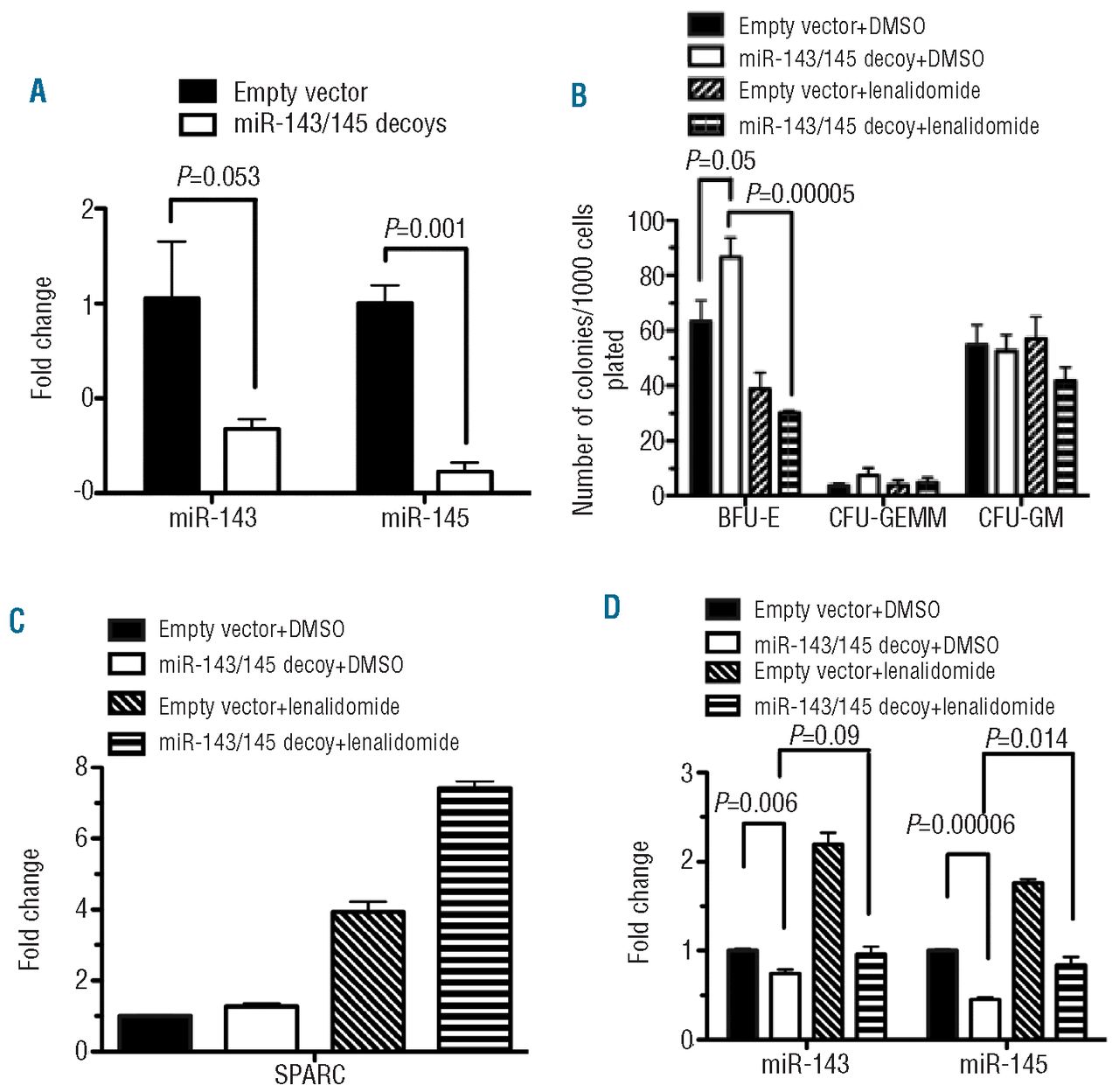 Figure 2.miR-143/miR-145 knockdown increases ery-throid progenitor activity of human CD34+ cord blood cells, which is selectively inhibited by lenalidomide. (A) Decreased expression of miRNAs was confirmed by RT-qPCR. Bars show the means±SE of 2 experiments. Clonogenic progenitor assays were performed following treatment of transduced cells in vitro with lenalidomide. (B) Increased BFU-E was demonstrated after transduction with the miRNA decoy. Lenalidomide exposure abrogated the increased clonogenic progenitor potential in transduced CD34+ cells. (C) SPARC mRNA expression was not affected by the decoy vector. (D) miR-143 and miR-145 was suppressed by the decoy vector. Bars show the means±SE of 3 experiments, each performed in duplicate.