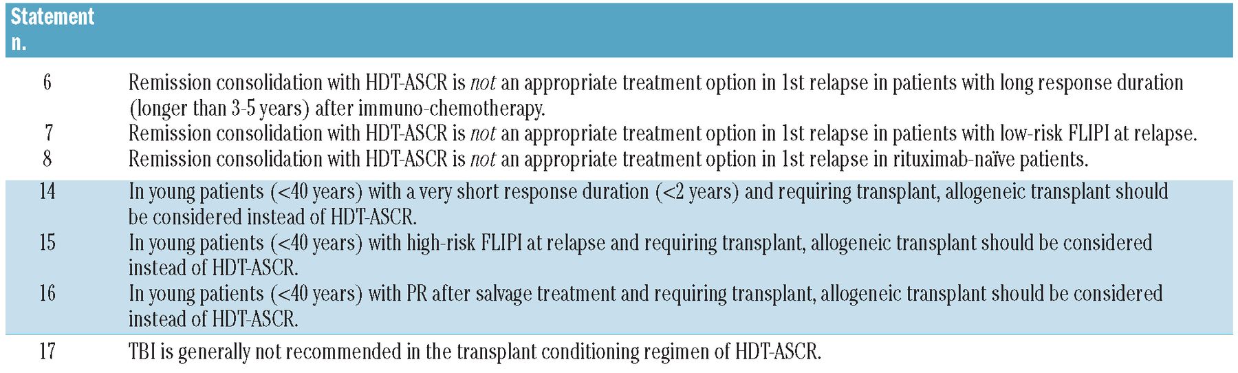 Contrasting with the consensus on HDT-ASCR in high-risk first relapse, there was no agreement on the possibility of obviating HDT-ASCR to consolidate second remission in patients with low-risk characteristics at first relapse (i.e. low-risk FLIPI, long first remission, or rituximab-naïve), with around one-third of the panel members considering that HDT-ASCR was indicated at first relapse even in patients with ‘good-risk’ features.