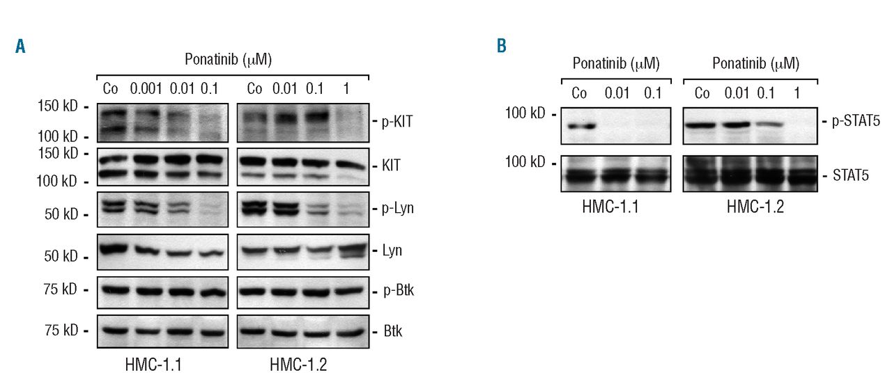Figure 1.Effects of ponatinib on phosphorylation of critical targets in HMC-1 cells. (A, B). HMC-1.1 and HMC-1.2 cells were incubated with various concentrations of ponatinib as indicated for 4 h. Thereafter, cells were subjected to western blot analysis as described in the text using antibodies directed against phosphorylated KIT (p-KIT), total KIT, phosphorylated Lyn (p-Lyn), Lyn, phosphorylated Btk (p-Btk) or Btk (A), or against phosphorylated STAT5 (p-STAT5) or STAT5 (B).