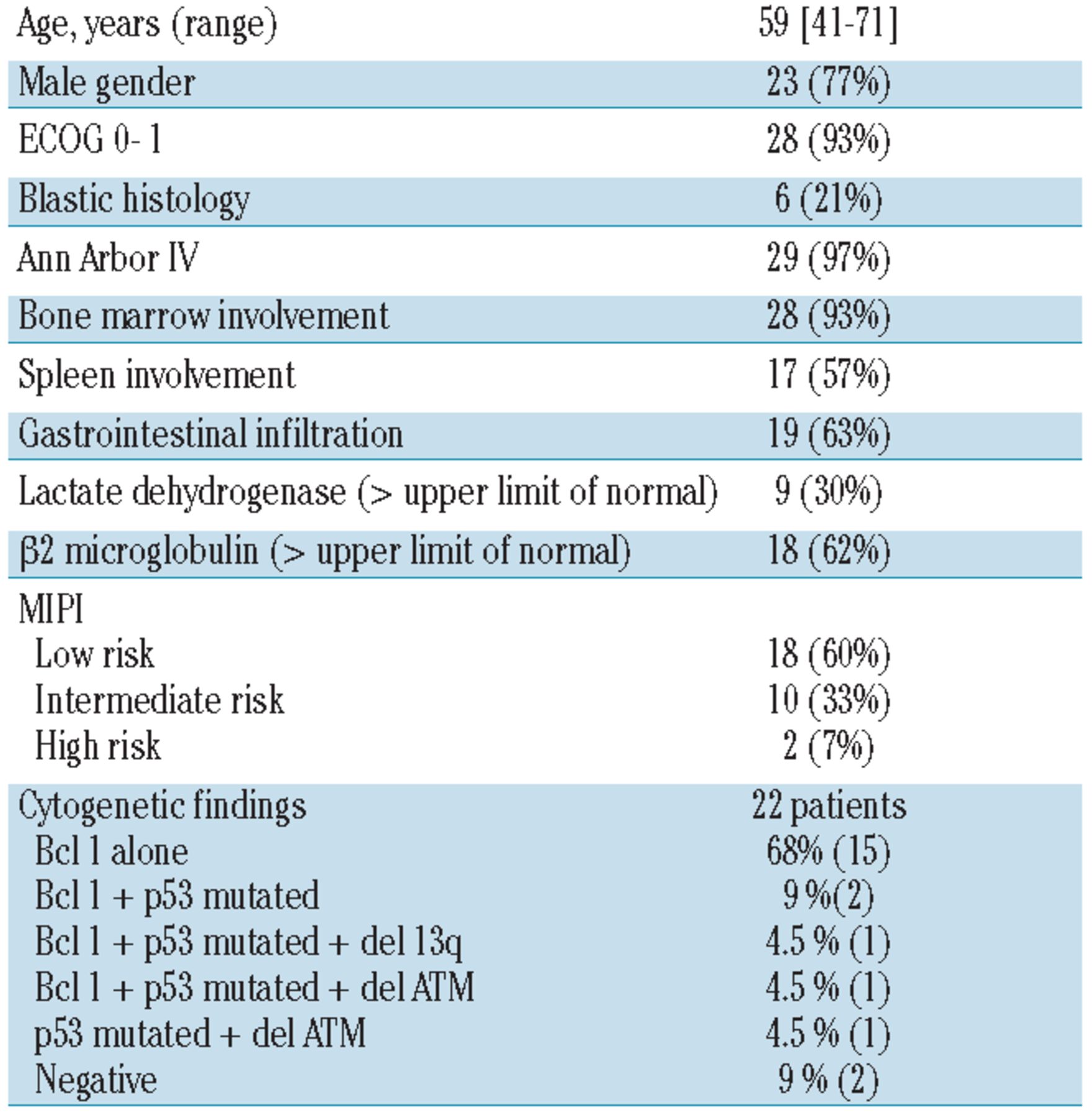 Between February 2006 and July 2008, 38 patients with untreated MCL from 12 institutions were registered for this study. Eight patients were not enrolled in the study because of: positive serology for hepatitis B virus (2 patients), central nervous system involvement (1 patient), old age (1 patient), localized disease (1 patient), patient’s refusal (1 patient), protocol deviation (1 patient) and urgency for treatment (1 patient). Therefore, 30 patients were evaluable for results.