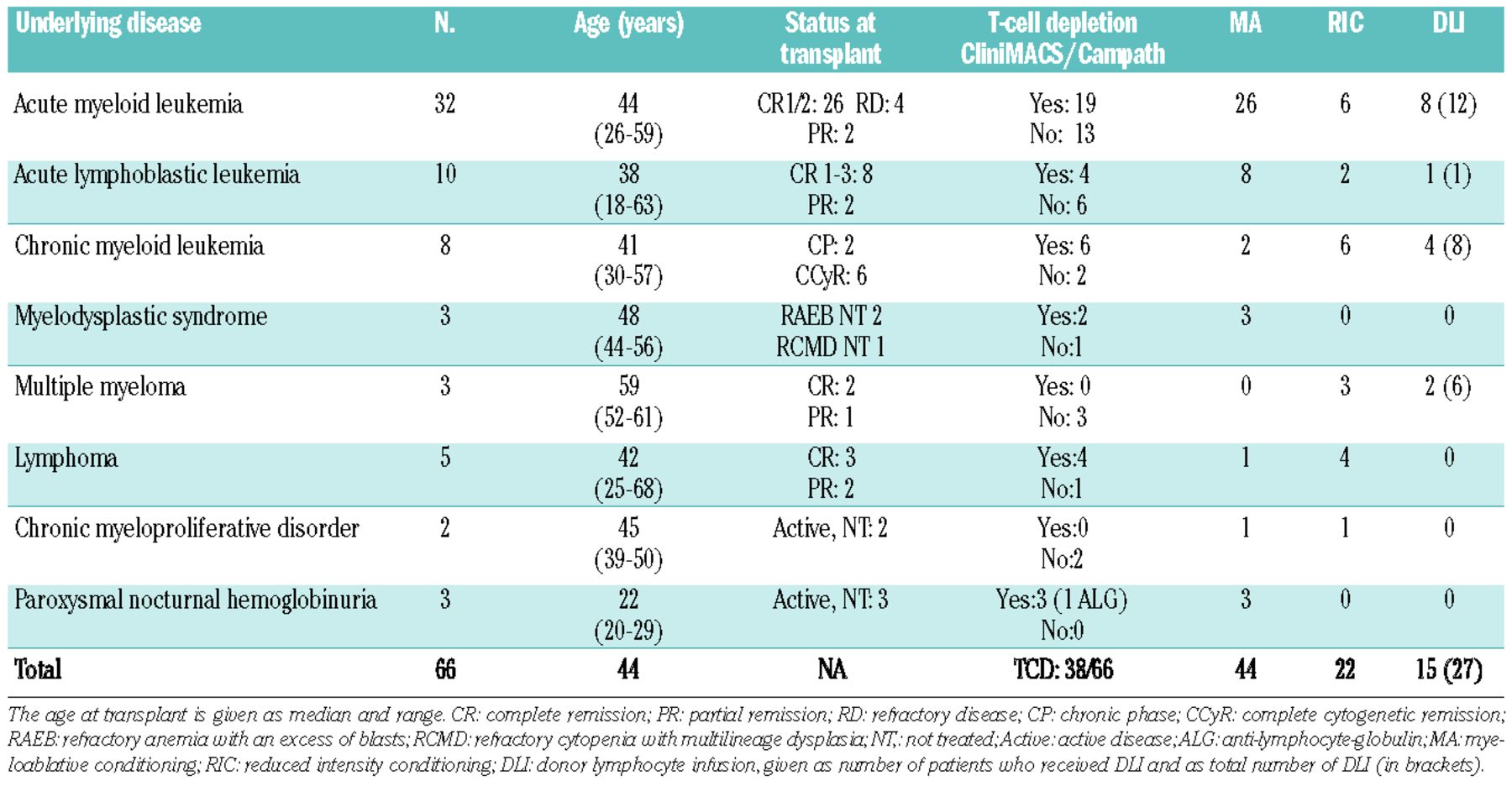 All patients received an allogeneic stem cell or bone marrow transplant between 2004 and 2008 at the bone marrow transplantation unit of the University of Ulm. The study was approved by the local ethics committee of Ulm University. All patients gave their informed consent to participation in the study. An overview of the patients’ characteristics is shown in Table 1. More information about the donor types is given in the Online Supplementary Material.
