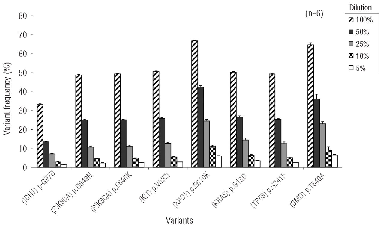 Sensitivity analysis was performed using several sequentially diluted samples of DNA from the cell line DLD1 (harboring 8 heterozygous mutations) into normal control DNA. Across six different sequencing runs each of eight heterozygous (monoallelic) mutations present in DLD1 were successfully detected in four sequential dilutions (50%, 25%, 10% and 5%) with minimal variation in the overall variant frequencies. The lowest detection limit was seen for the IDH1 p.G97D variant detected at a frequency of 1.5% in the 1:19 (5%) diluted DLD1 sample, indicating high detection sensitivity (Figure 5). Online Supplementary Table S5 provides a detailed summary of the dilution studies with H2122 (V1) and DLD1 DNA (V2) with expected and detected variant frequencies of the mutations at each dilution level.