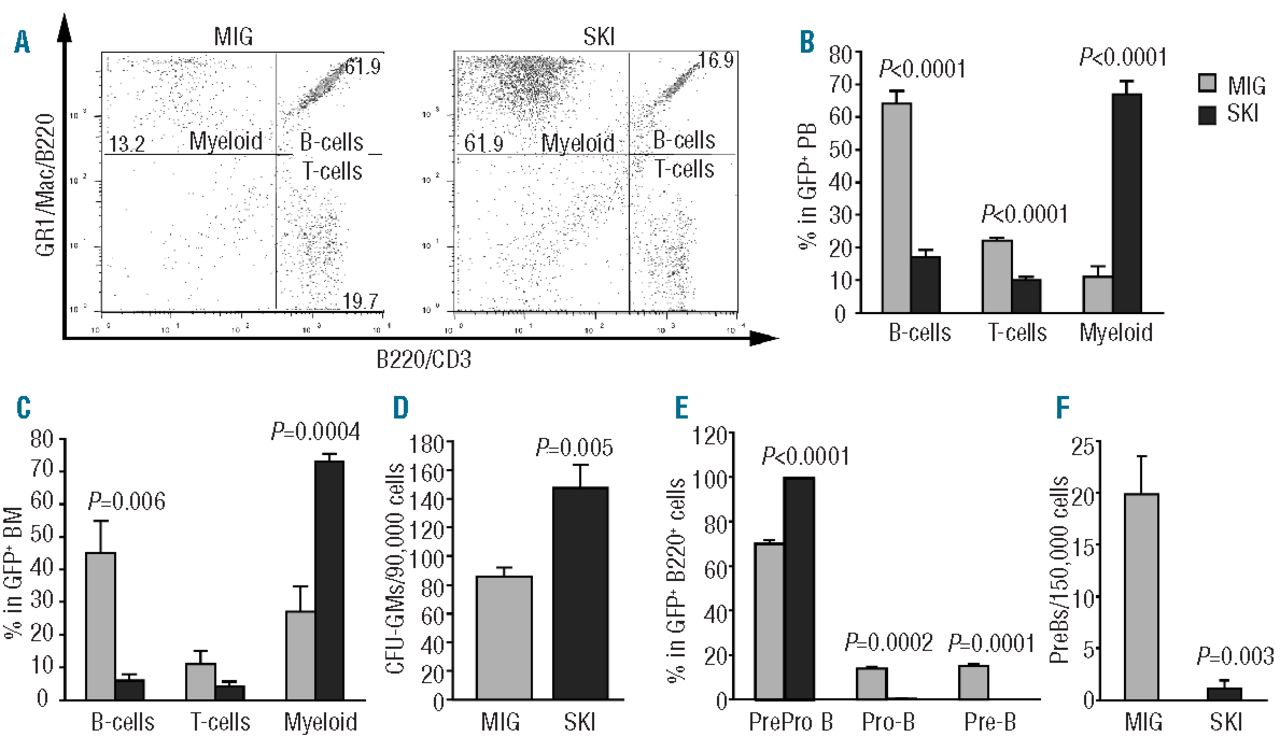 Figure 2.Increased levels of SKI result in skewing towards myeloid differentiation at the expense of lymphoid development. FACS analysis of lineage distribution in (A–B) PB and (C) BM, using the indicated markers. (D) Myeloid colony formation using unsorted BM cells from primary recipients. (E) FACS analysis of B-cell development in GFP+ B220+ BM cells from secondary recipients (PreProB; CD43+CD19−, ProB; CD43+CD19+, PreB; CD43−CD19+, n=4 for MIG and 5 for SKI). (F) Pre-B-cell colony formation using unsorted BM from primary recipients. Data were collected 16 weeks post transplantation and are presented as mean ± S.E.M. (n=8 for MIG and 9 for SKI if not stated otherwise).