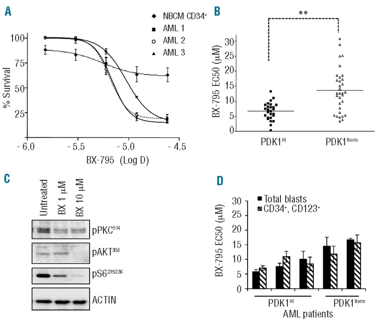 Figure 4.BX-795 induces cell death in AML blasts over-expressing PDK1. (A) Effect of BX-795 on the survival of normal bone marrow (NBM) CD34+ blasts (n=6) and representative PDK1Hi primary AML blasts. Survival is expressed as percentage viability compared with cells treated with vehicle alone. (B) Half maximal effective concentration (EC50) of BX-795 between PDK1Hi (n=26) and PDK1Norm (n=32) M4/M5 AML blasts (**P<0.001). (C) Western blot analysis of PDK1 target kinase phosphorylation following 60 min incubation with BX-795; data representative of 9 patient samples analyzed. (D) BX-795 EC50 levels in the total AML blast population compared with the CD34+, CD123+ subpopulation.