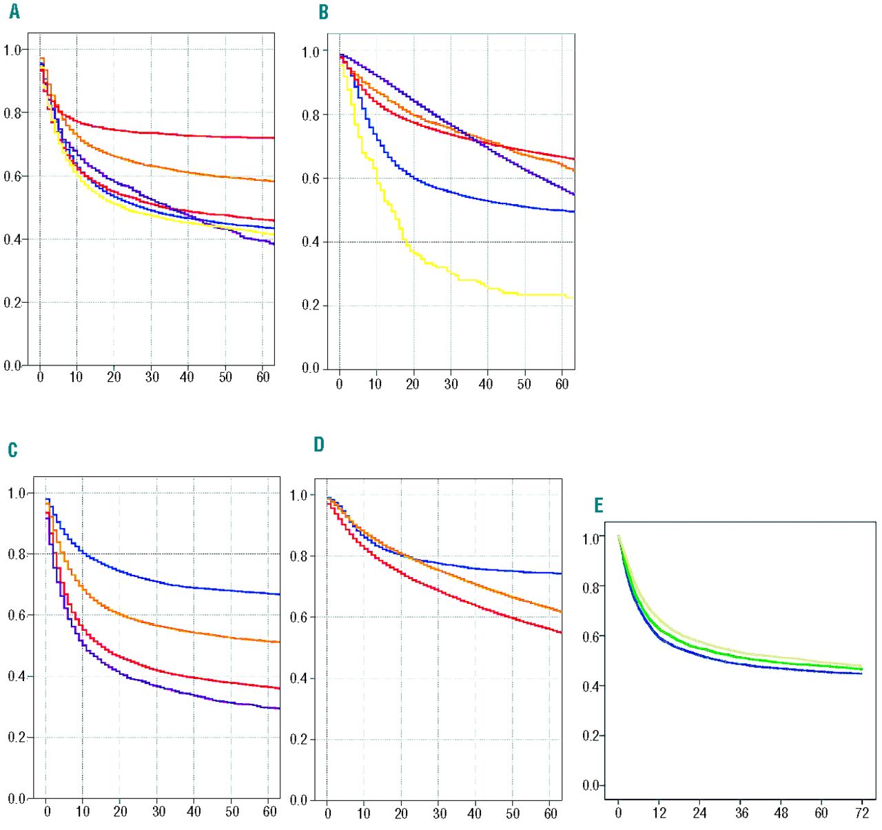Figure 1.The figure depicts the diversity of the population of patients and the heterogeneity in outcome as illustrated by the Kaplan-Meier estimates of overall survival for 107,904 patients who underwent allogeneic (n=41,623) or autologous (n=66,281) HSCT in Europe between 1999 and 2006. (A) Allogeneic HSCT and (B) autologous HSCT showing overall survival by main disease category (acute leukemia, blue; chronic leukemia, orange; lymphoma, red; plasma cell disorders, purple; myelodysplastic disorders/myeloproliferative neoplasms, yellow; and bone marrow failure syndromes, allogeneic only, pink). No P values are given. The figure simply illustrates the heterogeneity; the study was not meant to assess differences between main disease categories. (C) Allogeneic HSCT and (D) autologous HSCT showing overall survival depending on EBMT risk score. Allogeneic HSCT: score 0+I (n=7,217; blue), score II+III (n=18,524; yellow), score IV+V (n=13,781; red), and score VI+VII (n=2,101; lilac). Autologous HSCT: score 0+I (n=3,889; blue), score II+III (n=36,290; yellow), and score IV+V (n=39,883; red). The hazard ratios for increasing risk with increasing score are depicted in Table 2. (E) Overall survival (OS) of 15,618 patients with an allogeneic HSCT in 1999 (4,742 patients; OS at 3 years 47.3%; blue), in 2002 (5,043 patients; OS at 3 years 50.5%; green) and in 2005 (5,833 patients; OS at 3 years 53.8%; yellow), illustrating the improvement over calendar time.