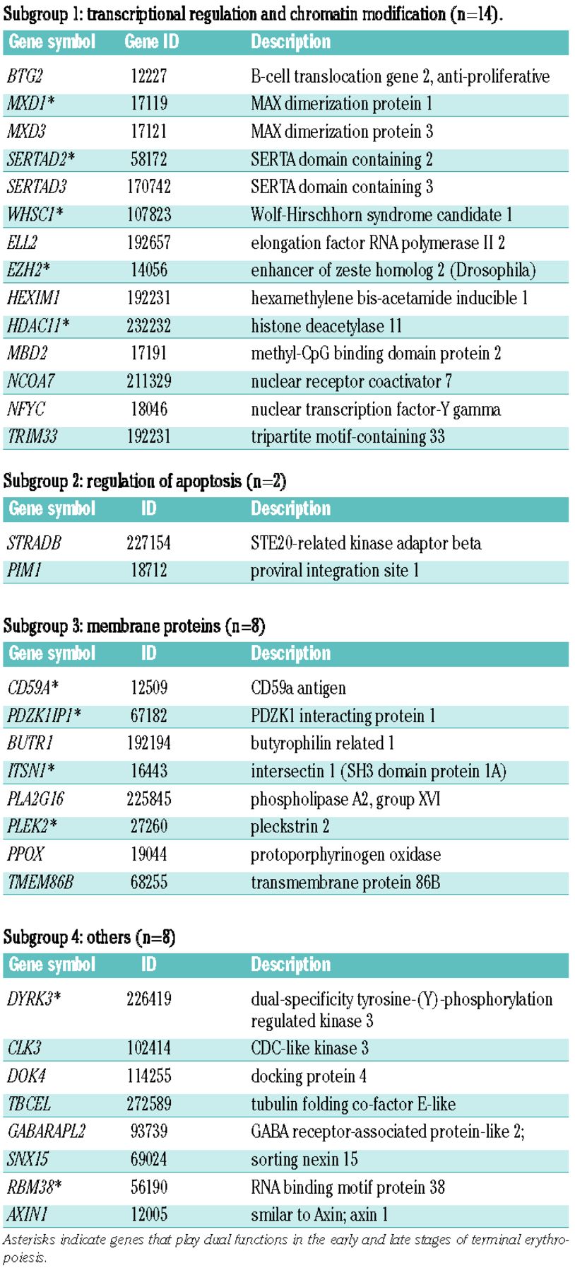 Our screening results also revealed that the same pathways are commonly used in the early and late stages of terminal erythropoiesis. Among the hit genes, many are functionally important in transcriptional regulation, chromatin modification, membrane dynamics and apoptosis in other cell types. Correlating with previous reports of their high expression levels,22 genes involved in these pathways represent potential key regulators in terminal erythropoiesis. This is directly confirmed by the finding that Ezh2, one of our hit genes and an enzymatic component of the polycomb repressive complex 2 (PRC2), is important for fetal erythropoiesis.45 This work was reported after our screening and served as a perfect example of the significance of the genes we had discovered in erythropoiesis.