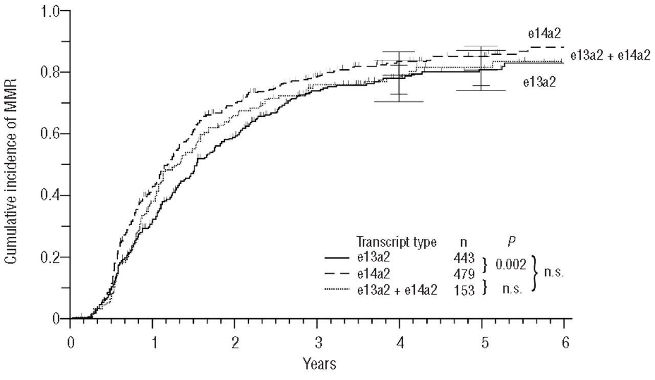 Patients expressing one single transcript showed a difference in the cumulative incidence (CI) of MMR (P=0.002), whereas the e13a2+e14a2 transcript group did not differ to either side (not significant) (Figure 2). There was a substantial difference in median time to MMR when e13a2 was compared to e14a2 (18.4 vs. 14.2 months), while CI of MMR after five years of treatment was 81% versus 85%.