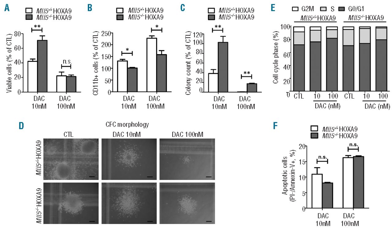 Figure 2.Immortalized Mll5 wild-type mouse bone marrow cells are more sensitive to decitabine (DAC) treatment than Mll5 null cells. (A) Cell viability upon low- or high-dose DAC treatment relative to DMSO solvent control (CTL) treatment. 1 × 105 cells were plated in duplicate (mean ± SEM, n=5). (B) DAC-induced cell differentiation by immunophenotyping CD11b expression (mean ± SEM, n=3). (C) Colony yield from CFC assays performed with DAC-treated cells in comparison to CTL-treated cells (mean ± SEM, n=3). (D) Morphology of representative colonies from 3 independent CFC assays. Scale bars represent 100μm. (E) Cell cycle profiles upon CTL or DAC treatment (mean, n=3). (F) Frequency of apoptotic cells represented by PI negative and Annexin-V positive staining upon DAC treatment and normalized to CTL treatment (mean ± SEM, n=3). n.s.: not significant; *P < 0.05; **P < 0.01.