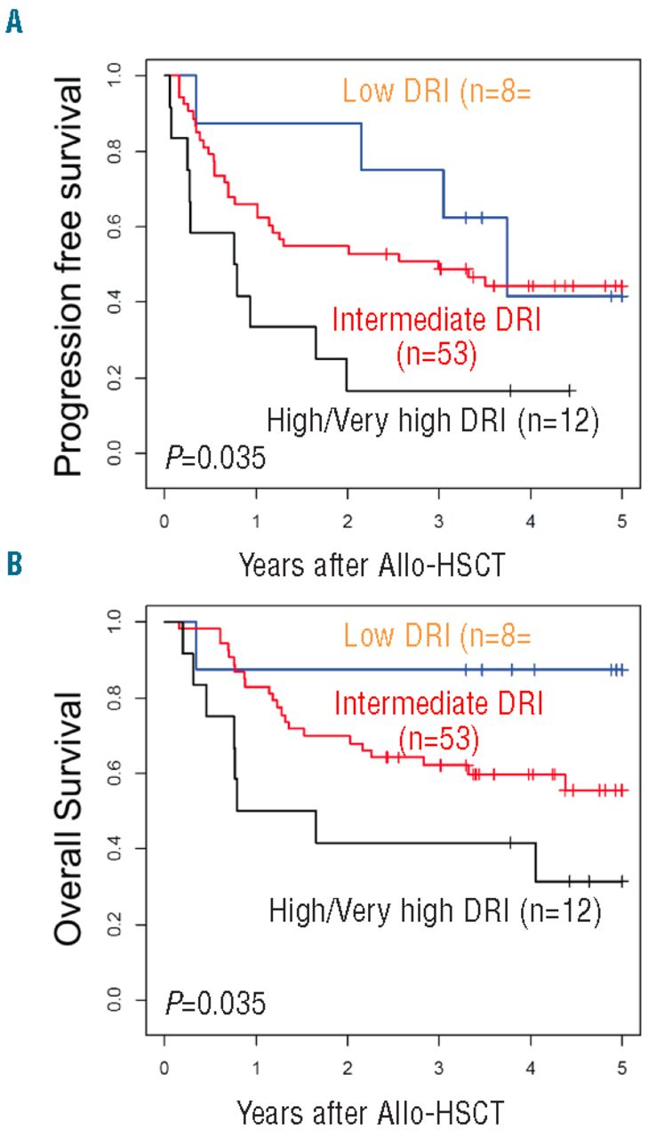 Figure 2.Outcome according to the revised disease risk index (DRI). (A) Progression-free survival (PFS). (B) Overall survival (OS).