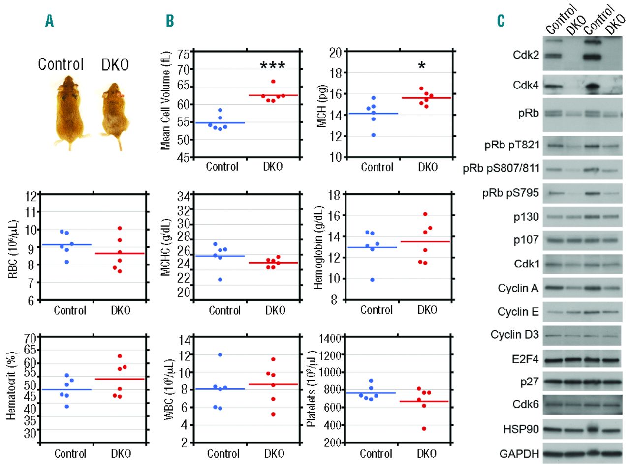 Figure 1.Cdk2 and Cdk4 regulate erythroid cell size. (A) Two-month old Cdk2fl/flCdk4−/−vavCre (DKO) and littermate wild-type (Control) mice are shown. (B) Complete blood count data for Cdk2fl/flCdk4−/−vavCre (DKO) mice (n=6) and littermate controls (n=6, wild-type or double het-erozygotes) at two months of age. Two-tailed t-test results are indicated by asterisks; *P<0.05, **P<0.01, ***P<0.001. (C) Western blot analysis of total bone marrow (BM) from 4-month old Cdk2fl/flCdk4−/−vavCre (DKO) and littermate Cdk2+/+Cdk4+/+vavCre or Cdk2+/flCdk4+/−vavCre control mice (Control) with the indicated antibodies. HSP90 and GAPDH served as loading controls.