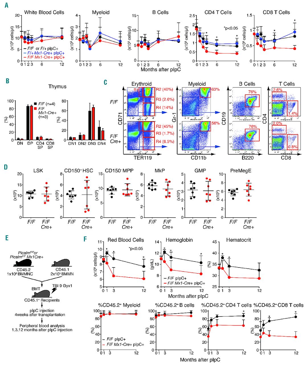 Figure 2.Picalm is dispensable for myeloid and B-lymphoid development. (A) Time-course analysis of non-erythroid cells in peripheral blood upon pIpC injection. White blood cell counts were examined at indicated time points after injections. Proportions of myeloid and lymphoid cells were determined by FACS. Each plot represents average value of 10–18 mice; error bars: standard deviation. (B) Graph shows frequencies of CD4/8 double-negative (DN), CD4/8 double-positive (DP), CD4 single-positive (CD4SP) and CD8 single-positive (CD8SP) T cells 2 months after pIpC injections (left). Frequencies of DN fractions (DN1: CD44+CD25−, DN2: CD44+CD25+, DN3: CD44−CD25+ and DN4: CD44−CD25−) are also shown (right). (C) Representative FACS profiles of bone marrow cells from control (PicalmF/F) and Picalm knockout mice (PicalmF/F Mx1Cre+) 2 months after pIpC injections. (D) Dot graphs of absolute counts (per leg) of hematopoietic stem/progenitors in bone marrow 2 months after pIpC injections. Stem/progenitors were identified by FACS as described elsewhere52. LSK (lineage-Sca1+c-Kit+); HSC (hematopoietic stem cells); MPP (multi-potential progenitors); MkP (megakaryocyte progenitors); GMP: granulocyte macrophage progenitors; PreMegE (pre-megakaryocyte–erythrocyte progenitors). Horizontal black bars: average value; error bars: standard deviation. (E) Schematic representation of a bone marrow transplant experiment. One million bone marrow mononuclear cells (BMMNC) from either control (PicalmF/F) or knockout (PicalmF/F Mx1Cre+) mice were transferred to a lethally-irradiated (9 Gy, single dose) recipient mouse along with CD45.1+ 2 × 105 BMMNC (competitors). Recipients were injected with pIpC 1 month after transplantation (250 mg × 3). (F) Peripheral blood counts were analyzed by a hematology analyzer and FACS 1, 3 and 12 months after pIpC injections. Each dot represents the average value of 12 samples in each group; error bars: standard deviation.