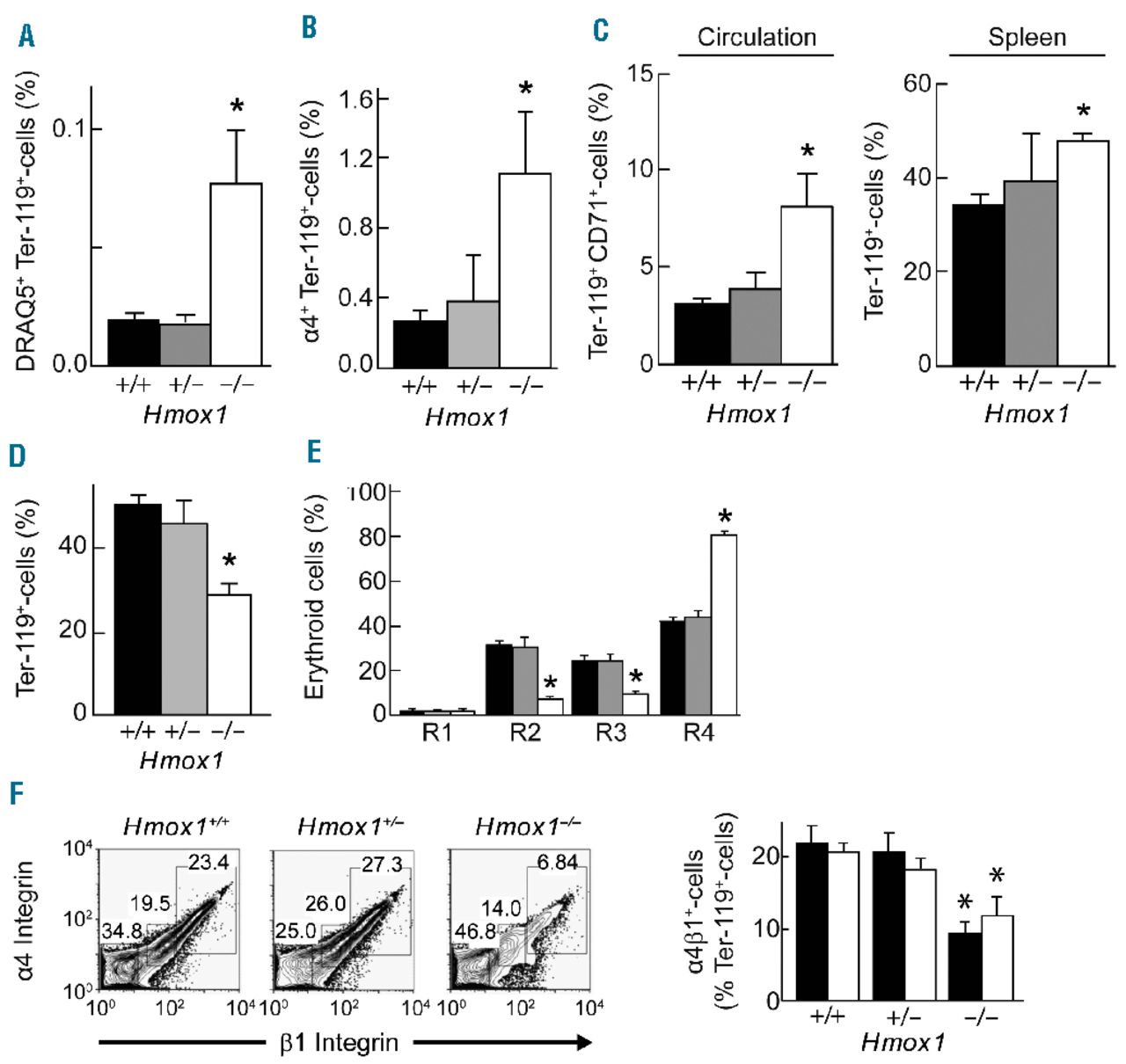 Figure 4.Absence of Hmox1 alters circulating and splenic erythroid population frequency. Hmox1 deficiency increases circulating erythroid cells that stain with (A) DRAQ5, (B) the erythroblast marker α4-integrin, and (C) CD71 (n = 5, 3 and 6 for Hmox1−/−, Hmox1+/− and Hmox1+/+ mice, respectively). (D) Increased frequency in Ter-119+ erythroid cells in the spleen of Hmox1−/− (n = 5) compared with Hmox1+/+ (n = 6) and Hmox1+/− (n = 3) mice. (E) Splenic erythroid maturation in Hmox1+/+ (black, n = 6), Hmox1+/− (gray, n = 3) and Hmox1−/− mice (white, n = 5) as assessed by expression of Ter-119+ and CD71+. (F) Decreased frequency of Ter-119+-erythroid cells expressing α4β1-integrin (left panel), α4β1high (black) or α4β1med integrin (white) (right panel). Data show representative flow cytometric profiles and their quantification (n = 3–10 for different groups). *P<0.05 compared with Hmox1+/+ and Hmox1+/− mice.