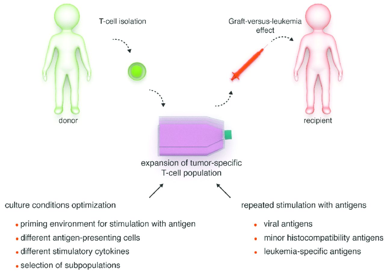 Figure 2.Schematic of ex vivo expansion of T cells. T cells are isolated from autologous or allogeneic donor sources, and are kept in culture under different conditions, with the eventual goal of expanding a tumor-specific T-cell population that is then infused back to the patient to elicit a GVL response.